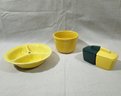 Group of ~6 assorted vintage ceramic tableware articles including a Lane & Co. yellow divided nut/candy dish, a Franciscan yellow & green condiment jars, and a yellow ramekin/bowl.