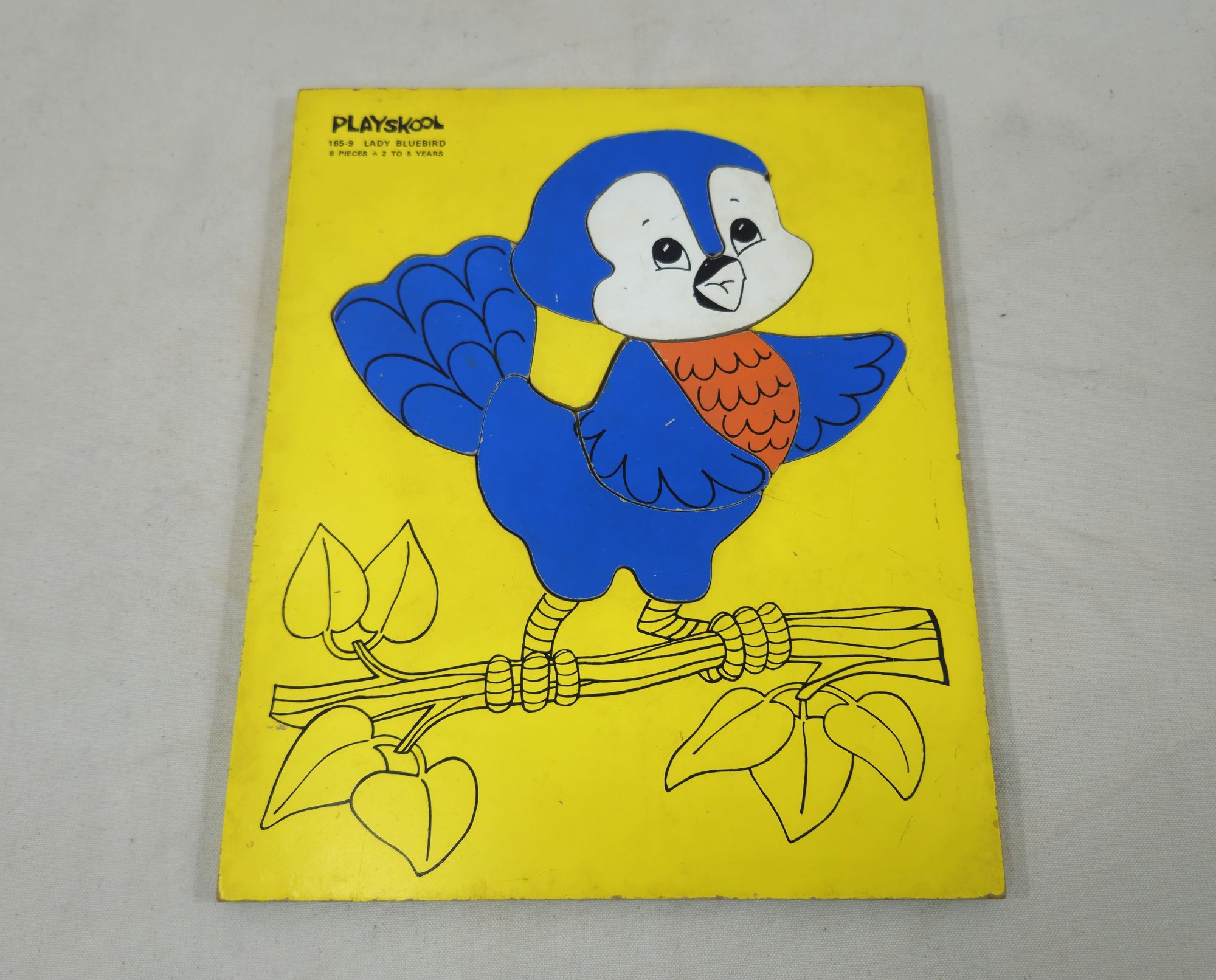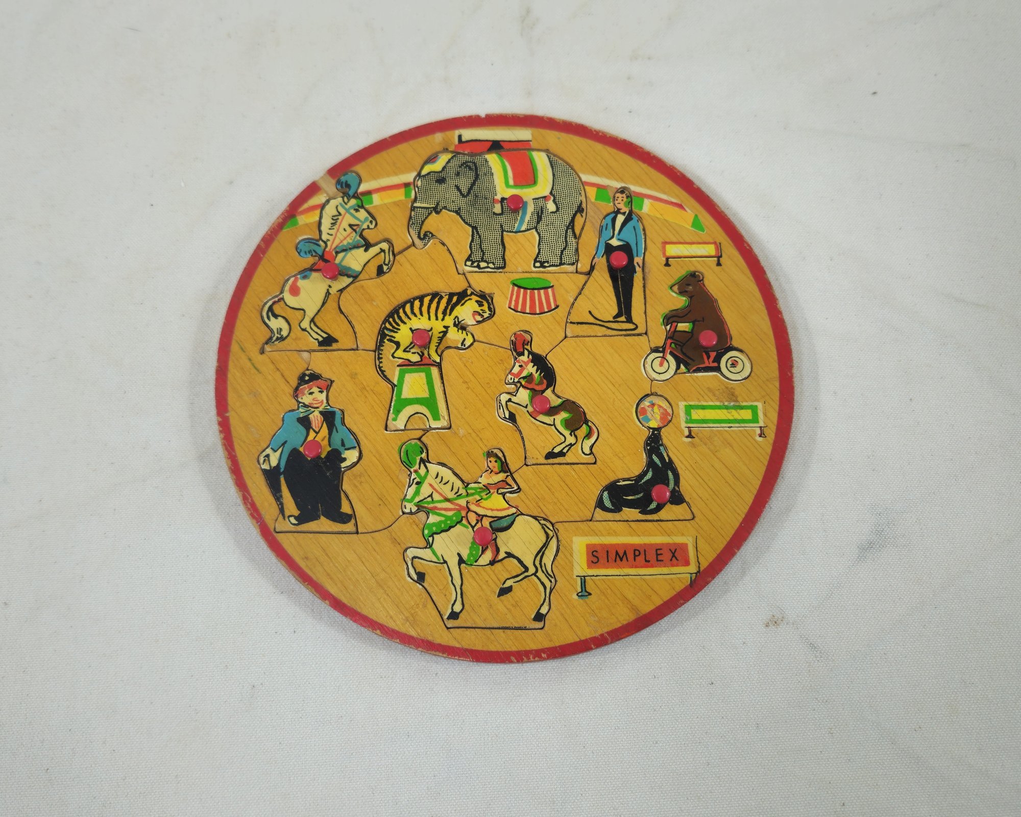 Group of ~4 assorted vintage children's toy wood puzzles including a Simplex Big Top Circus, a Kipod block puzzle, and a Playskool Lady Bluebird.