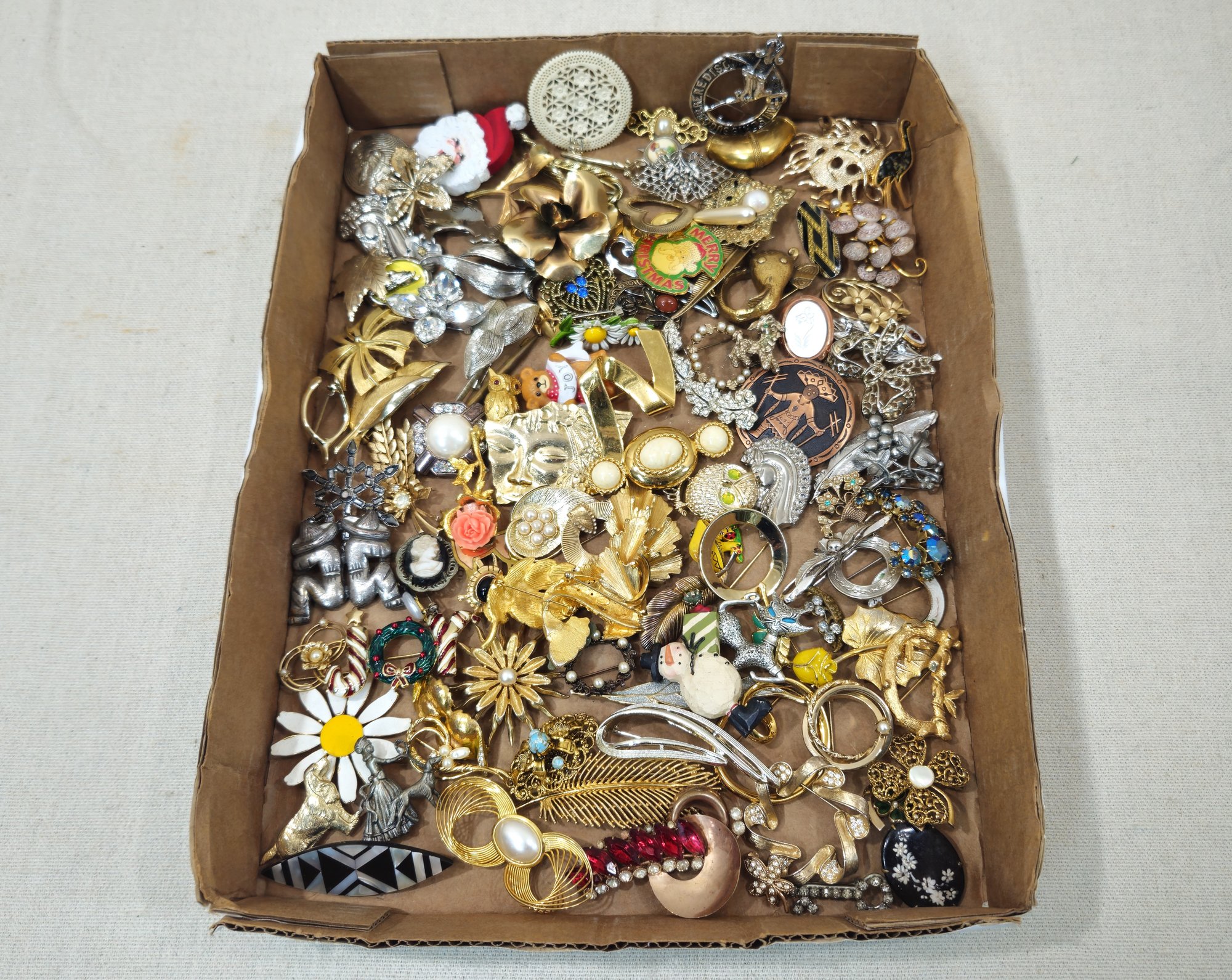 Group of assorted vintage costume jewelry pins & brooches.