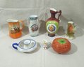 Group of ~6 assorted vintage Czech ceramic pottery articles including 1 pitcher, 3 bud vases, a candlestick, a Toby-style creamer, and a covered tomato jar. All pieces marked on base.