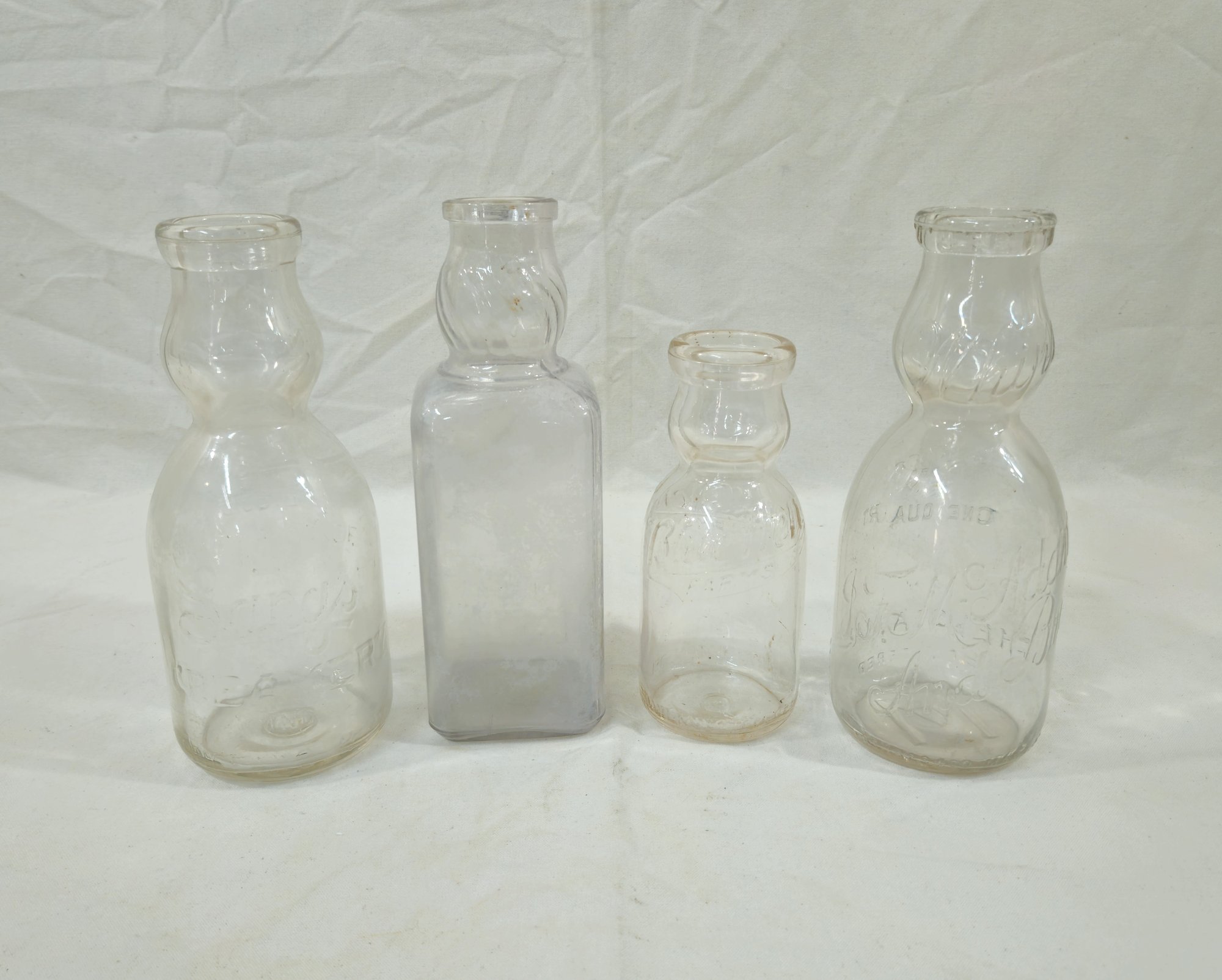 Group of ~4 assorted vintage dairy cream top glass milk bottles including a round embossed Blue Hen Farms- Wilmington, DE, a round embossed quart Lang's Creamery Inc.- Buffalo, NY, a round embossed quart J.F. McAdams & Bros.- Chelsea, MA, and a square unbranded slick quart with embossed swirl neck.