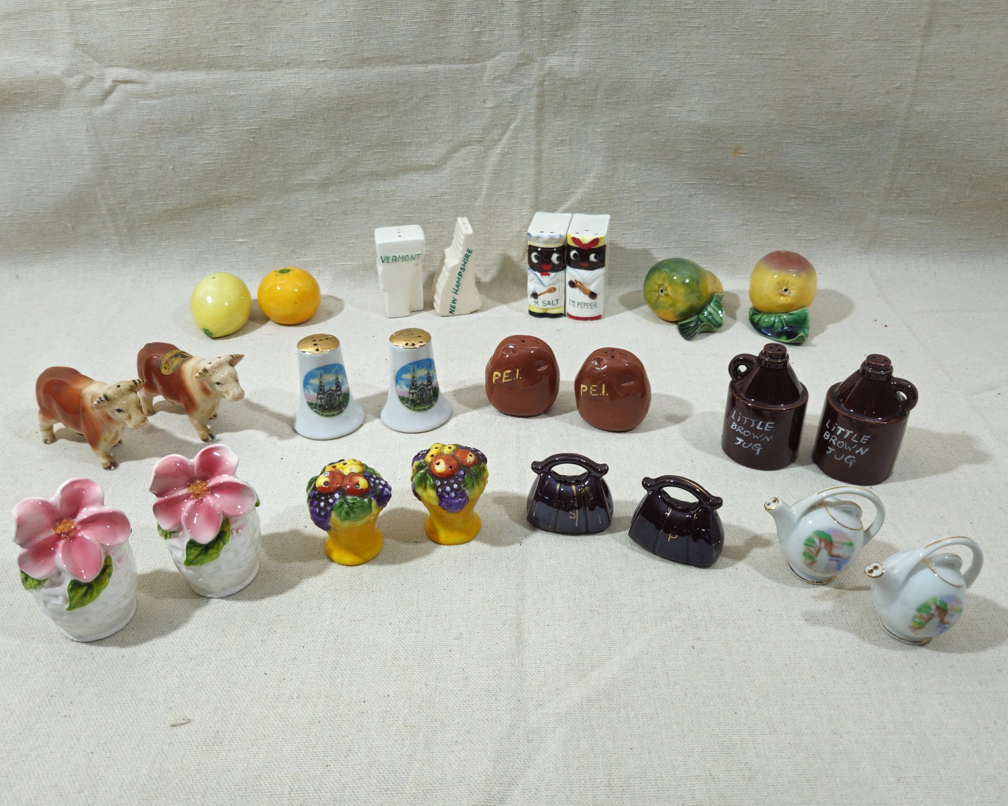 Group of ~12 assorted vintage figural souvenir and other ceramic salt & pepper sets including fruit, flowers, animals, and others. Various manufacturers.