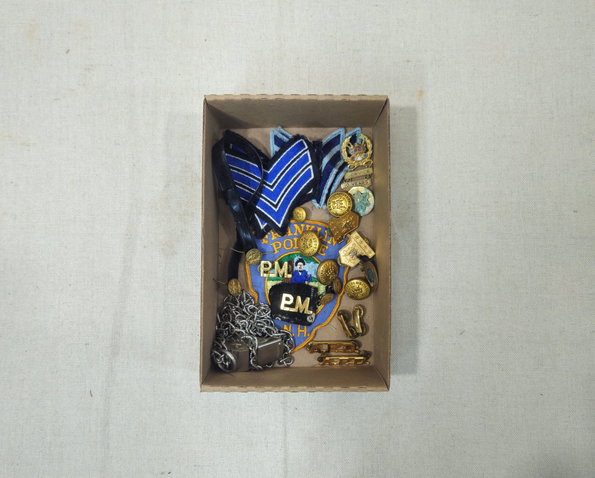Group of assorted vintage fraternal & police patches and pins including Franklin NH police patches, pins, a whistle & IOOF Patriarchs Militant fraternal buttons and pins.