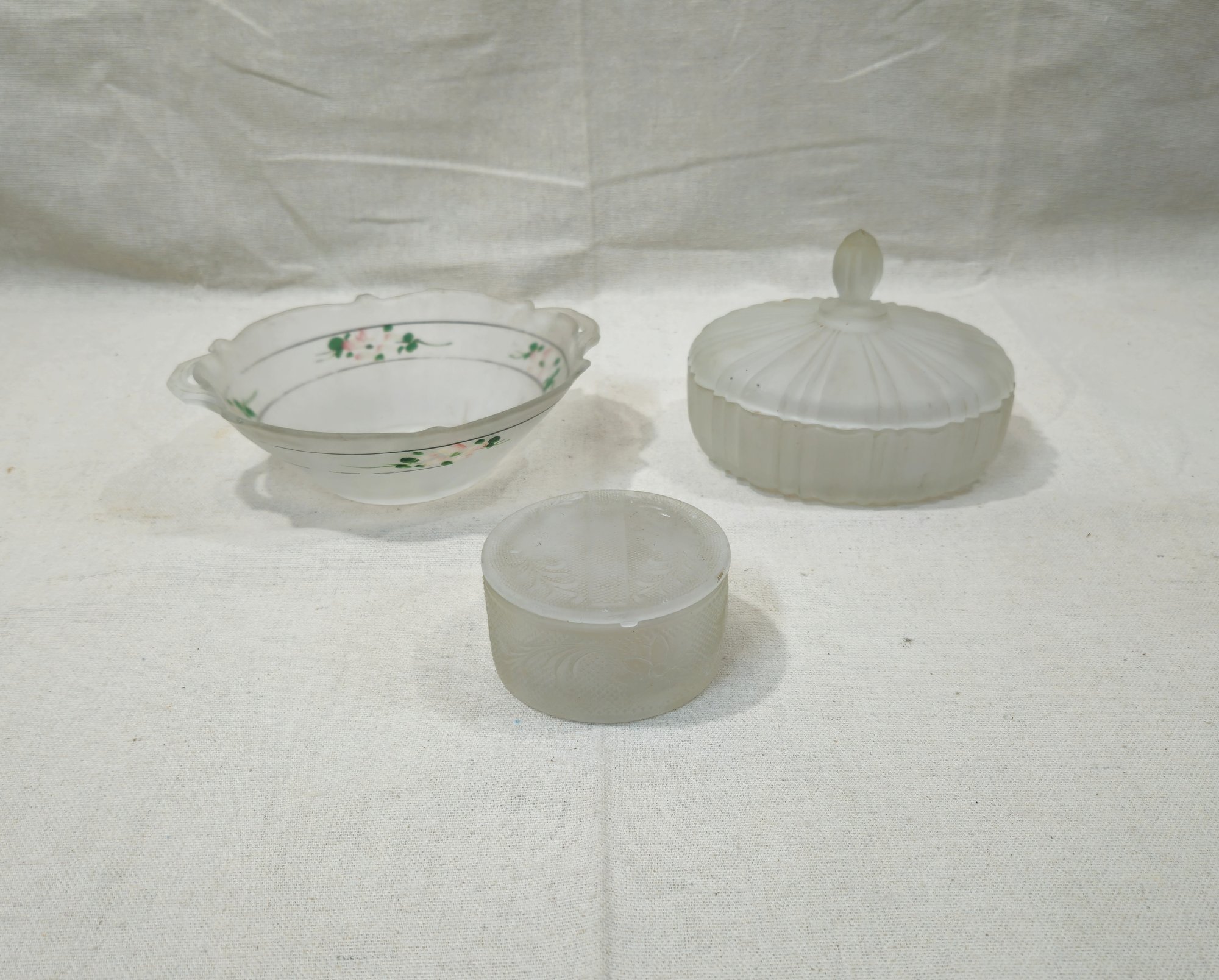 Notes: Assorted Vintage Frosted Glassware are pre-owned showing signs of wear commensurate with age & use. Please contact for further condition report or photos.