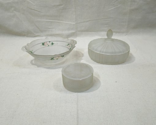Group of ~3 assorted vintage frosted glassware including a Lancaster Kay floral decorated bowl, an Anchor Hocking Old Cafe covered dish, and an Indiana Tiara Sandwich round covered trinket dish/puff box.