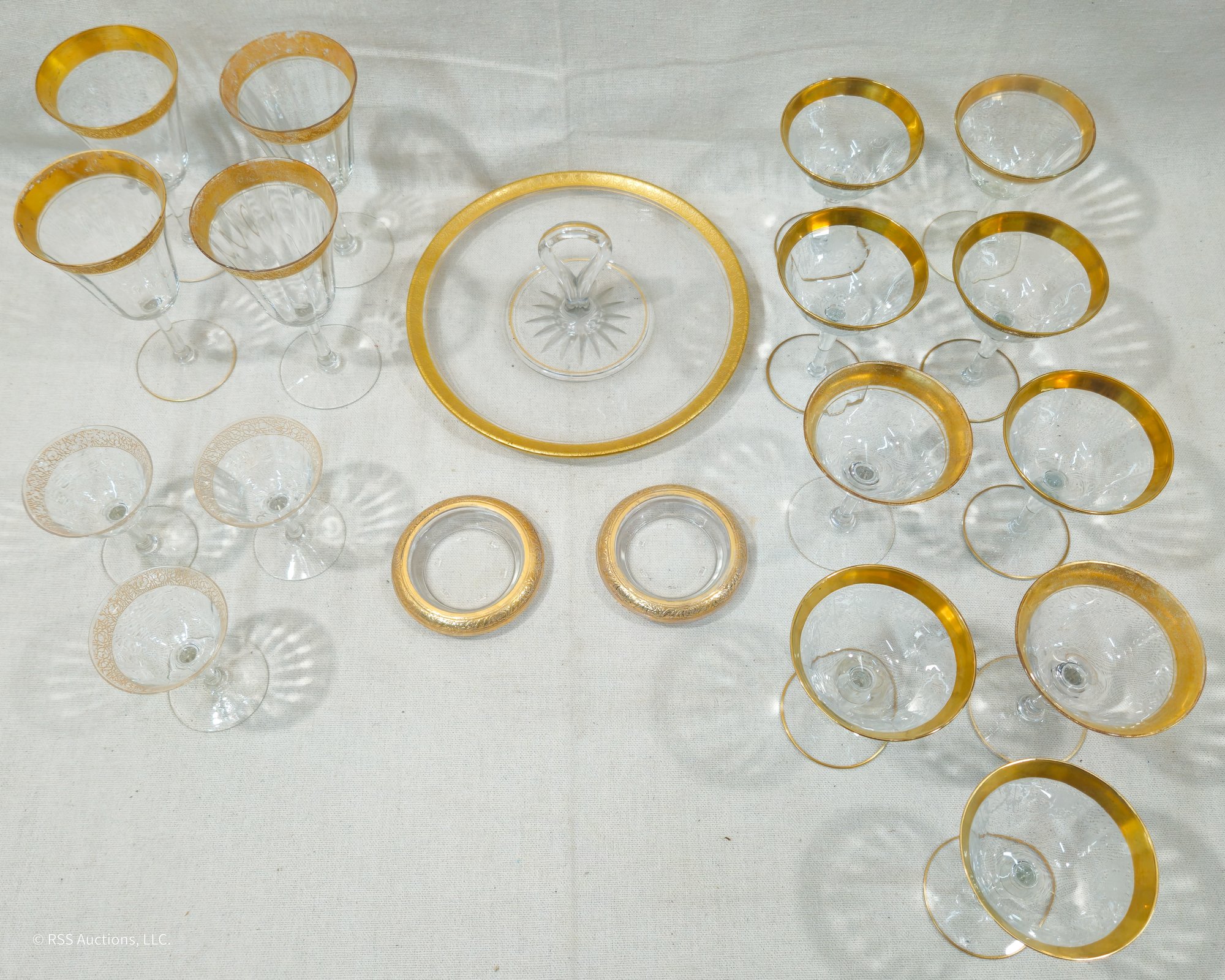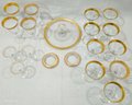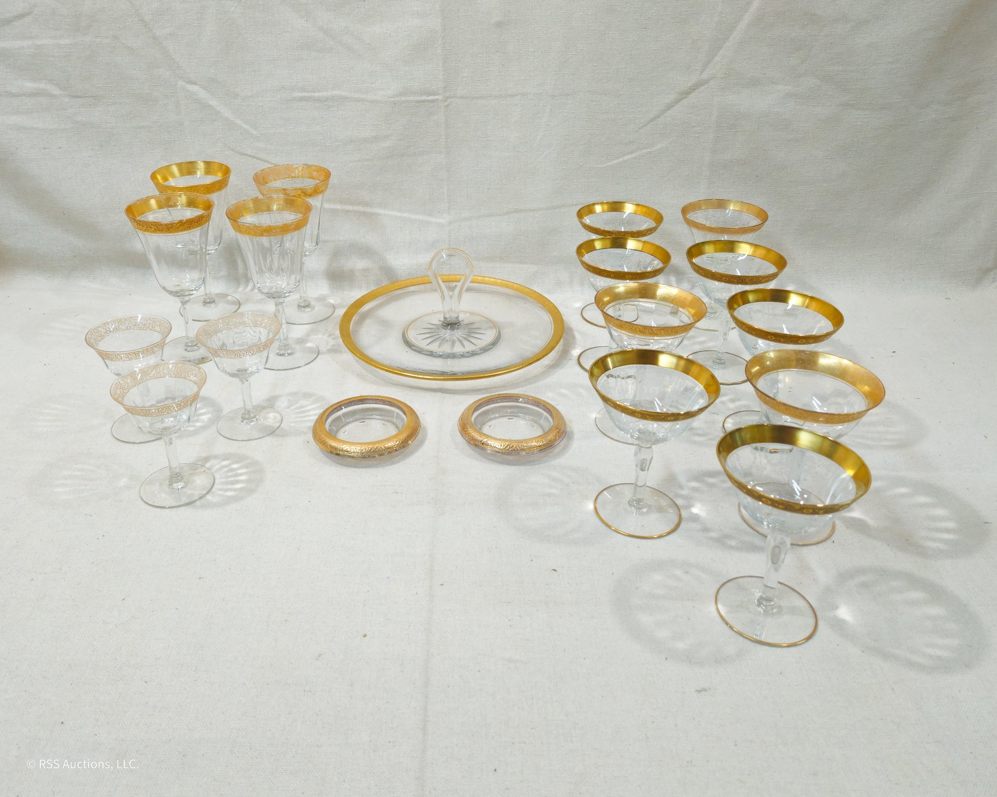 Group of ~19 assorted vintage gilt accented glass ware including a tidbit tray, glassware, and coasters.