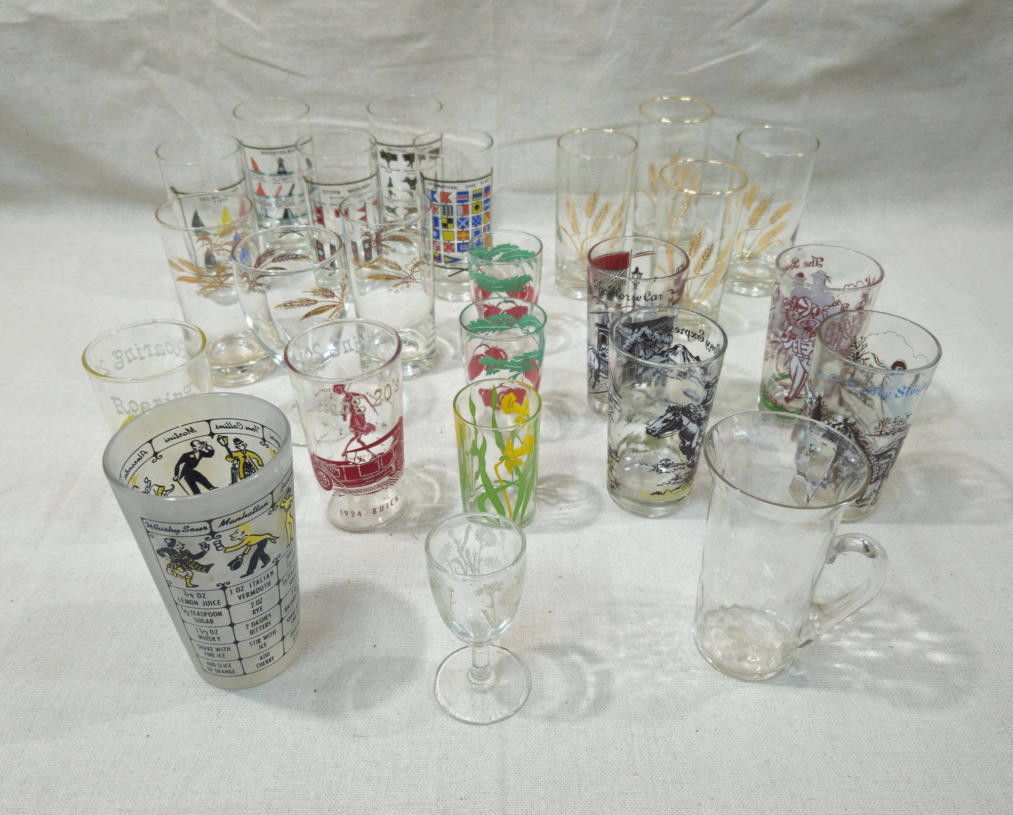 Group of ~24 assorted vintage glass drinkware in various sizes & designs.