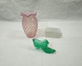 Group of ~3 assorted vintage hobnail pattern glass articles including a Fenton vase in pink opalescent, a Fenton Cat's Head green novelty shoe/slipper, and an Anchor Hocking Moonstone opalescent trinket covered box.