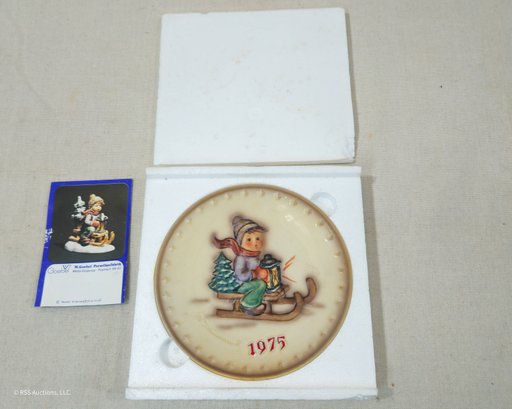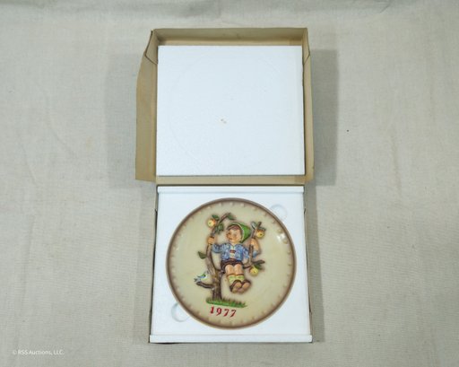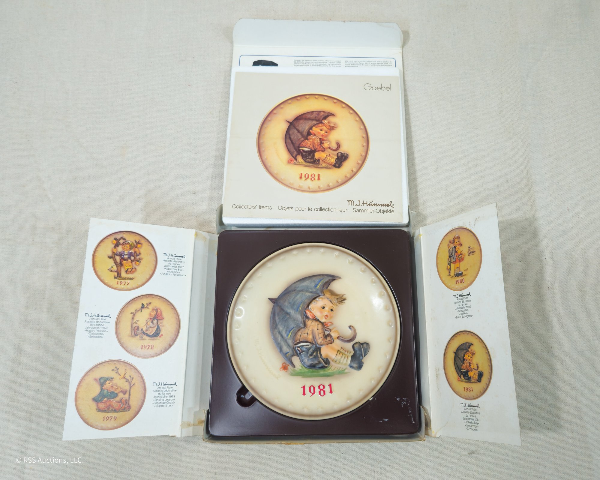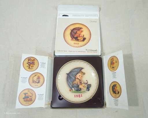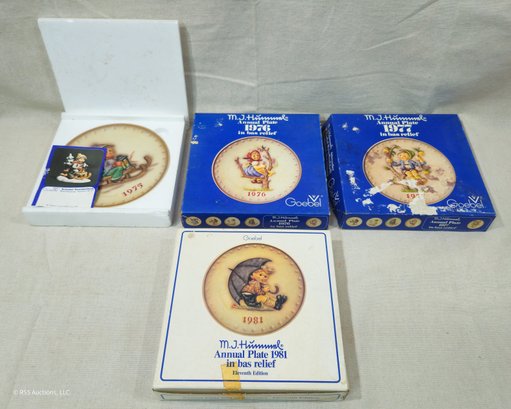 Group of ~4 assorted vintage M.J. Hummel Annual plates in -Bas Relief including 1975-77 & 1981. 1976, 1977, & 1981 with original boxes. 1975 with original Styrofoam.