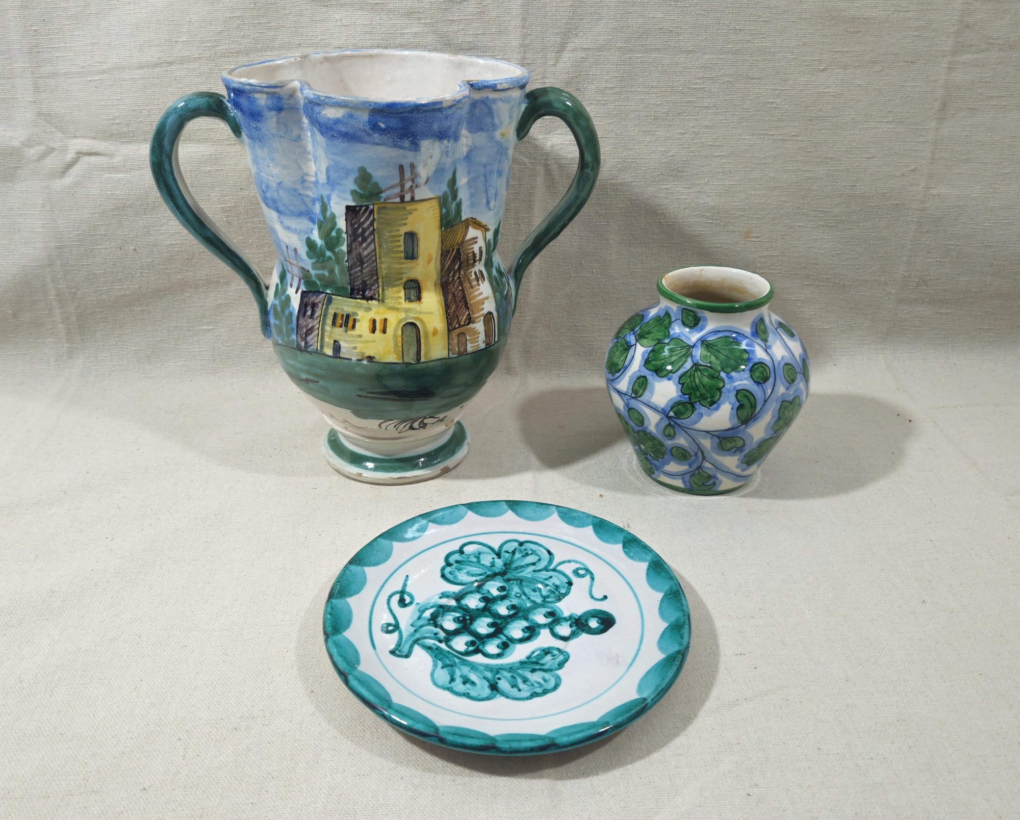 Group of ~3 assorted vintage Italian ceramics including a large double handled urn vase with painted village scene, a small squat bulbous vase with a painted vine pattern, and a snack plate with grape & leaf painted pattern.