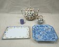 Group of ~5 assorted vintage Japanese hand painted ceramic articles including 2 dishes, a mini teapot, a large teapot, and a toothpick holder. All pieces marked on underside.