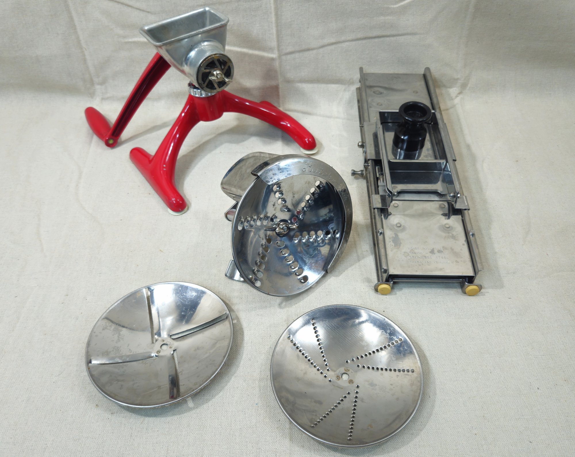 Group of ~2 assorted vintage kitchen gadgets including a Rival Kitcheneer Grind-O-Mat with additional Shred-O-Mat attachment and a Bron Couke slicer.