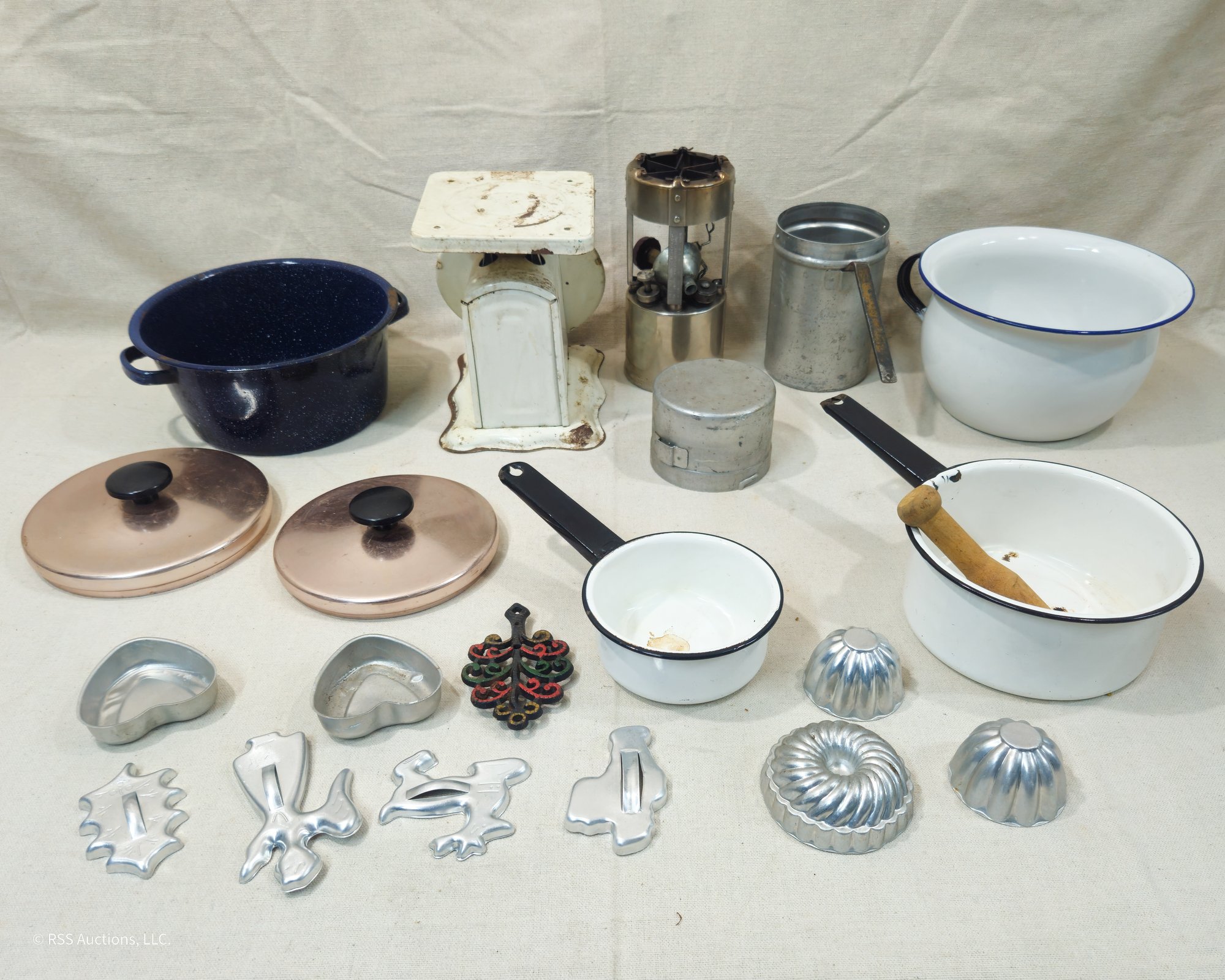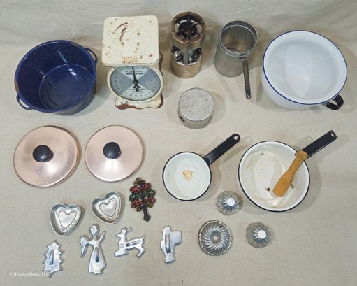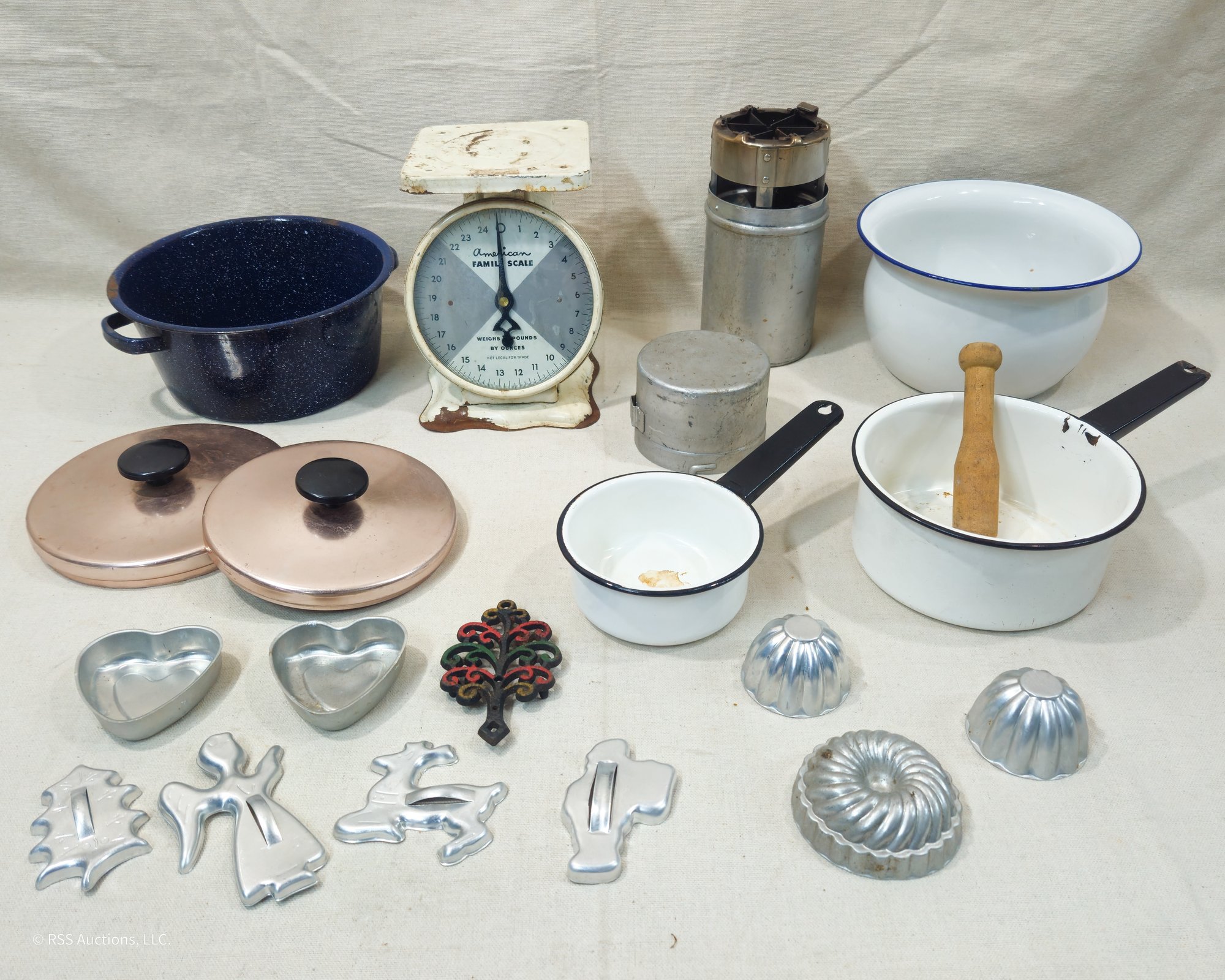 Group of ~18 assorted vintage kitchen metalware including various white enamel pots with black rims, a white enamel pot with blue rim, a blue speckled graniteware enamel pan, a scale, a camp stove, and others.