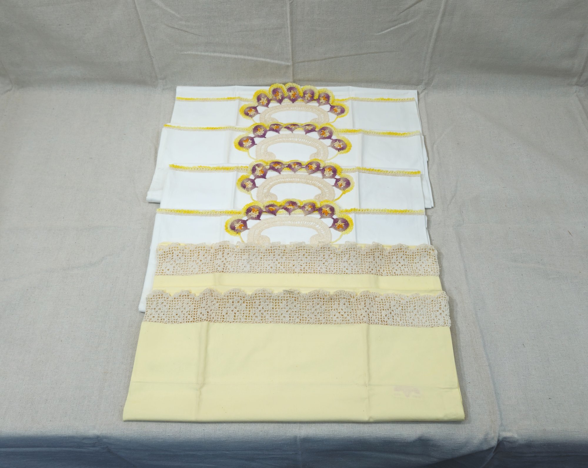 Group of ~6 vintage lace & crocheted trim pillowcases including 2 oversize yellow pillowcases with lace trim, 2 standard white pillowcases with embroidered floral trim, & 2 oversized white pillowcases with embroidered floral trim.