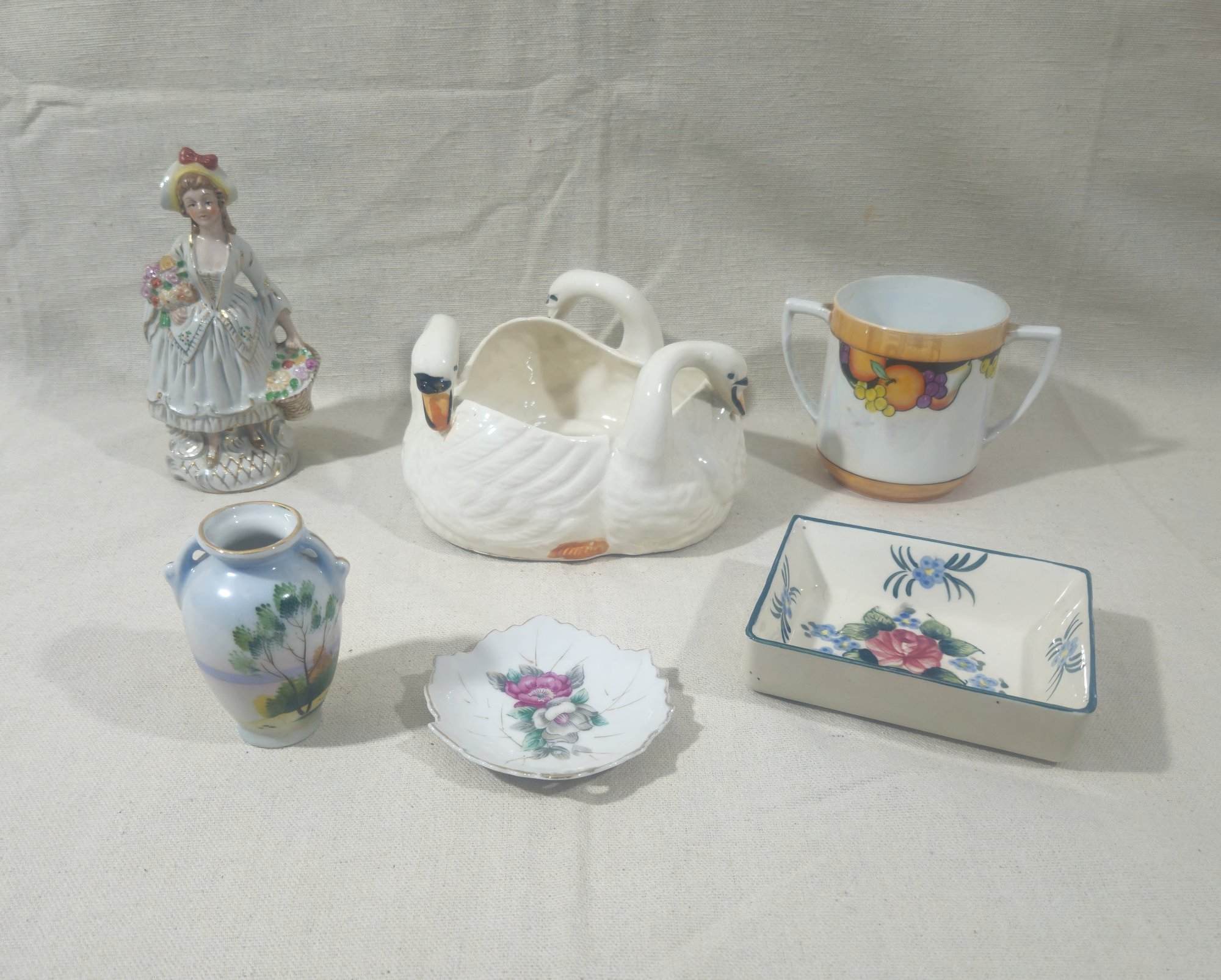 Group of ~6 assorted vintage Made in Japan ceramic articles including a round 3 swan dish, a Victorian-style female figurine, a square dish, a two handled mug, a leaf shaped dish, and a small bud vase. All marked "Made in Japan" on base.