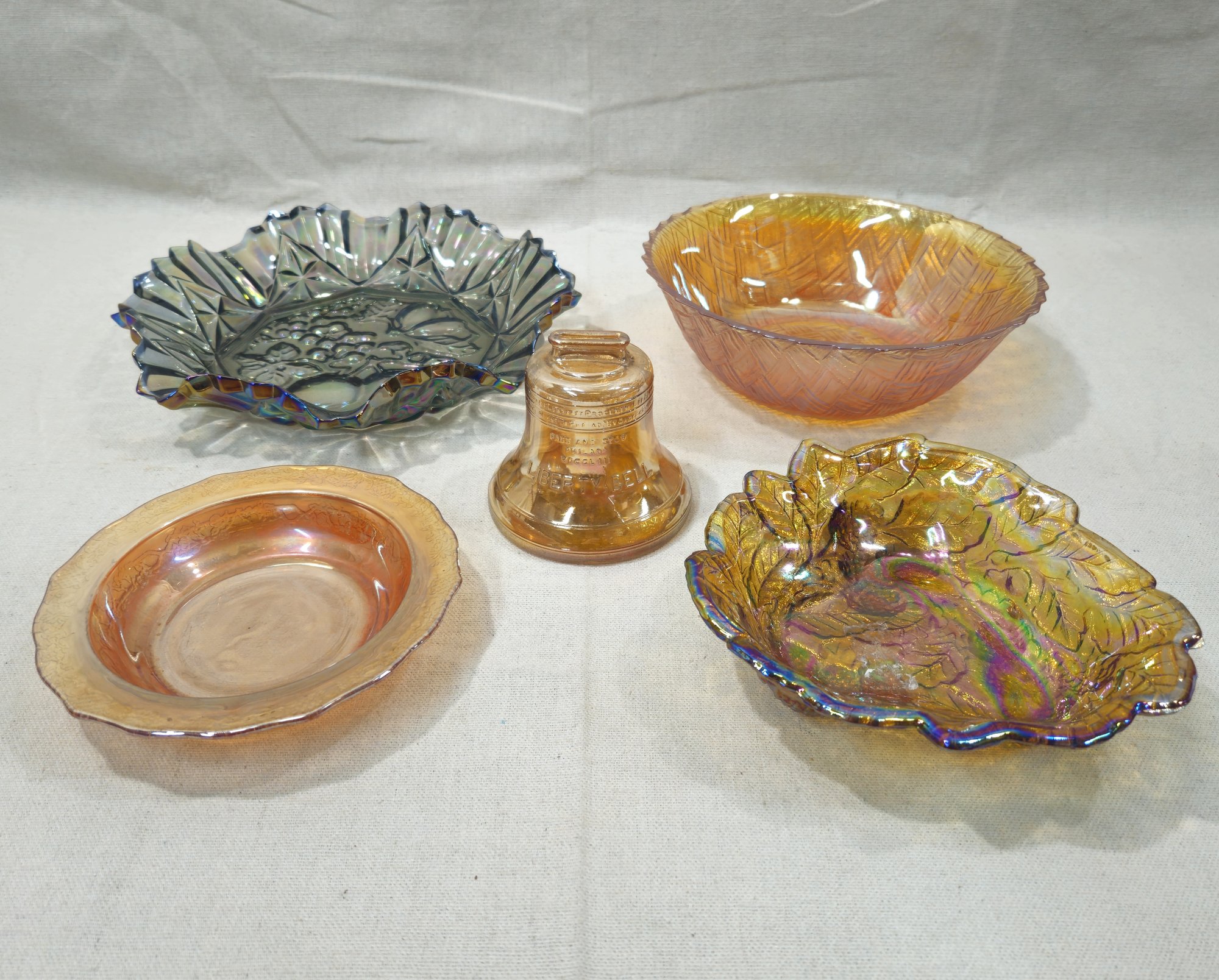 Group of ~5 assorted vintage marigold & other carnival glass articles including an Indiana Loganberry marigold carnival glass bowl, an Anchor Hocking Liberty Bell marigold carnival glass coin bank, a Federal Normandie marigold carnival glass bowl, an Indiana Basketweave carnival glass bowl, and a Federal Pioneer iridescent smoke carnival glass ruffled edge dish.