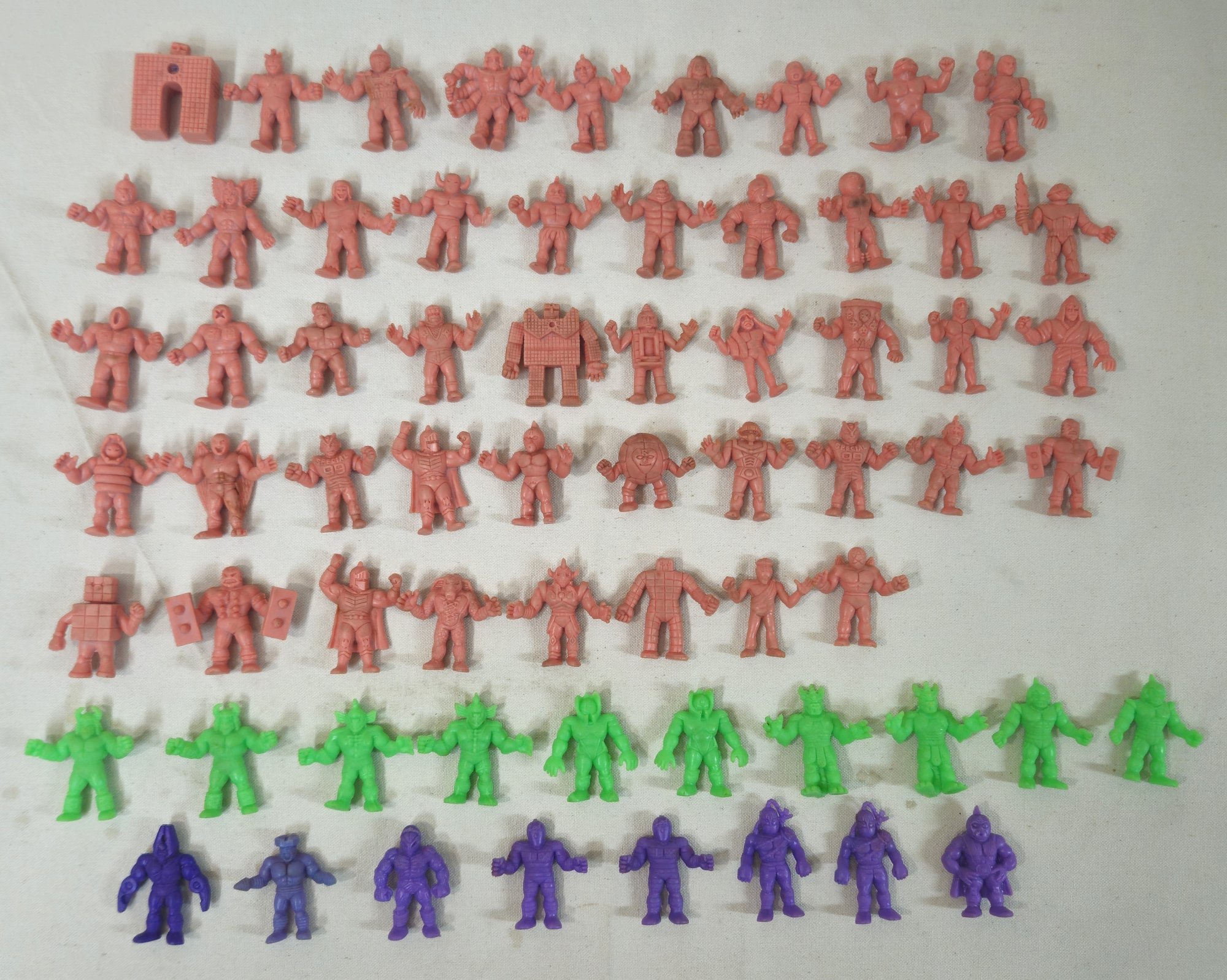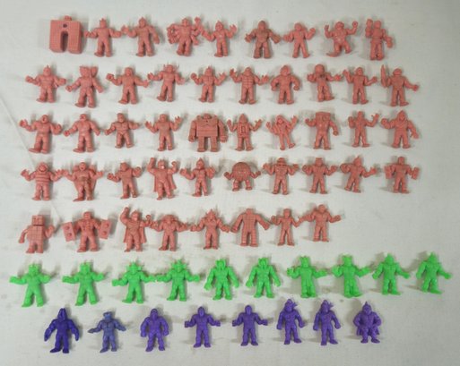 Group of ~65 assorted M.U.S.C.L.E. Men toy figures including 10 green, 8 purple, and 47 pink/flesh colored figures. Produced by Mattel.