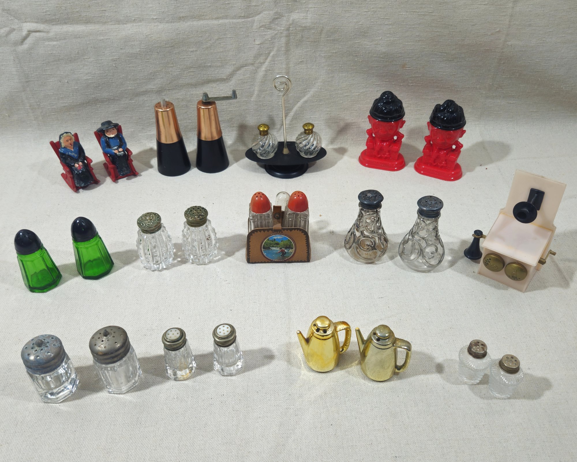 Group of ~13 assorted vintage metal, glass, & plastic salt & pepper sets including various forms and from various manufacturers.