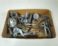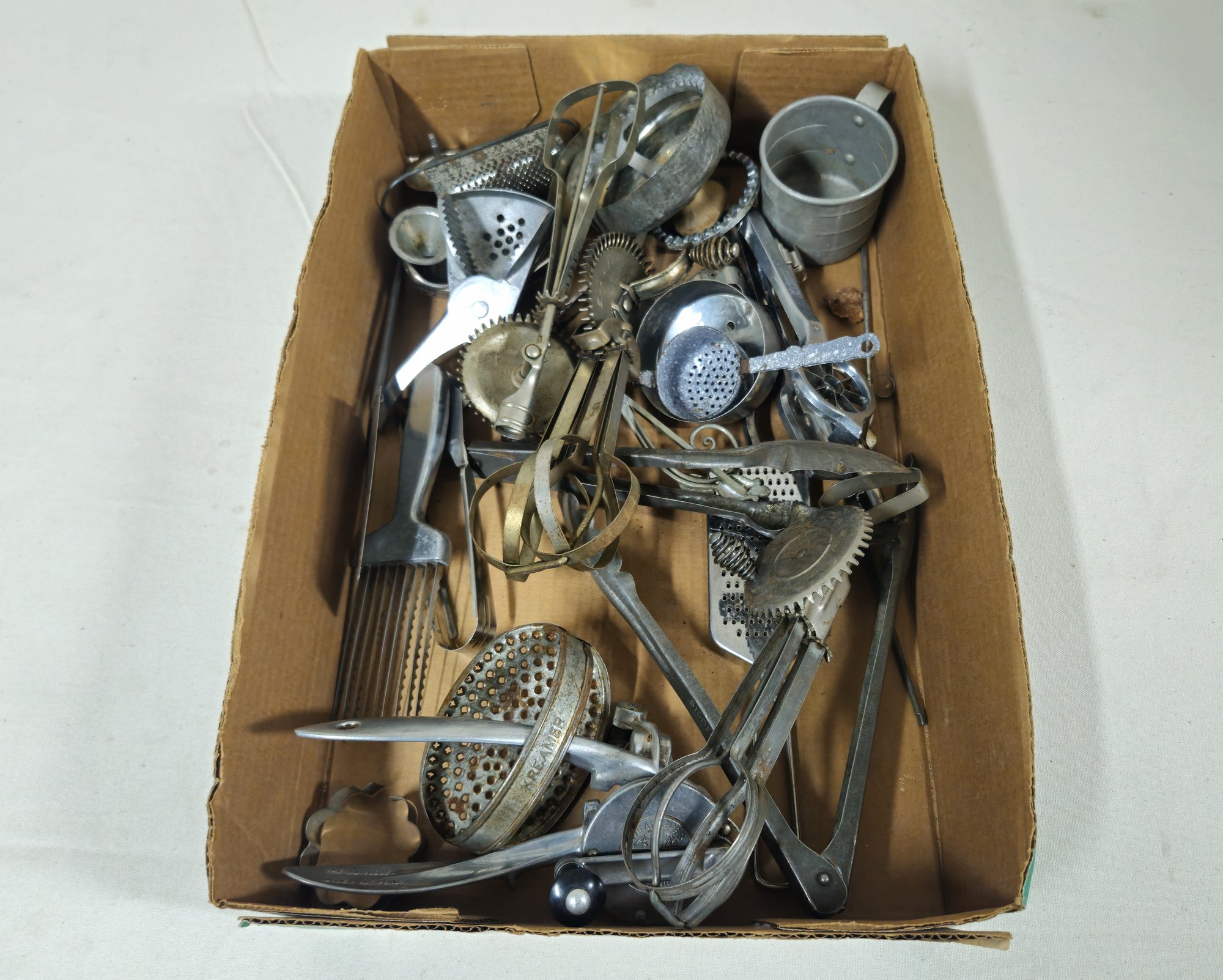Group of assorted vintage metal kitchen gadgets & utensils.
