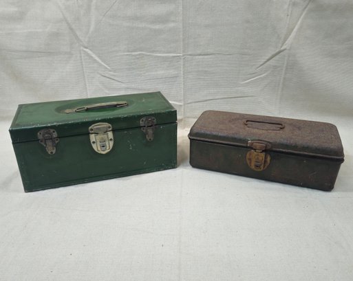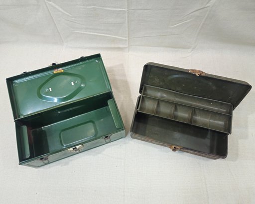 Group of ~2 assorted vintage metal utility boxes including a Master toolbox in green enamel paint and a tackle box in green paint. Toolbox retains Master Metal Products logo stick to underside of lid.