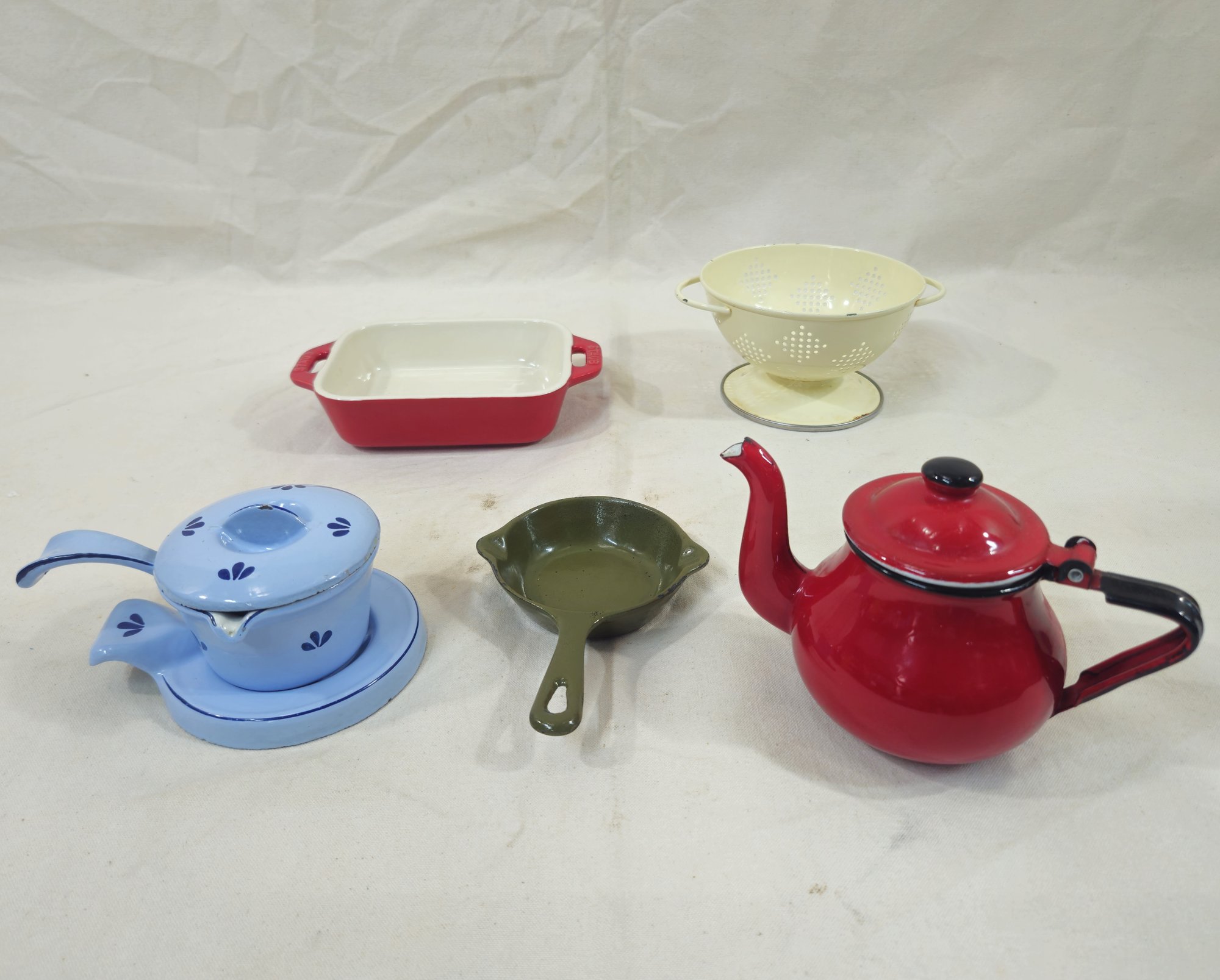 Group of ~5 mini enameled cookware articles including a Staub red enameled ceramic individual baking dish, a Dru Holland blue enameled cat iron Tulip butter sauce warmer, a Japan green enameled cast iron pan ashtray, an off-white enameled metal colander, and a red enameled metal teapot.