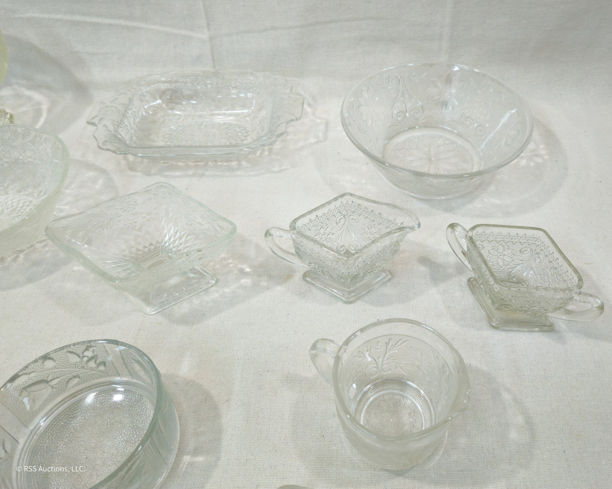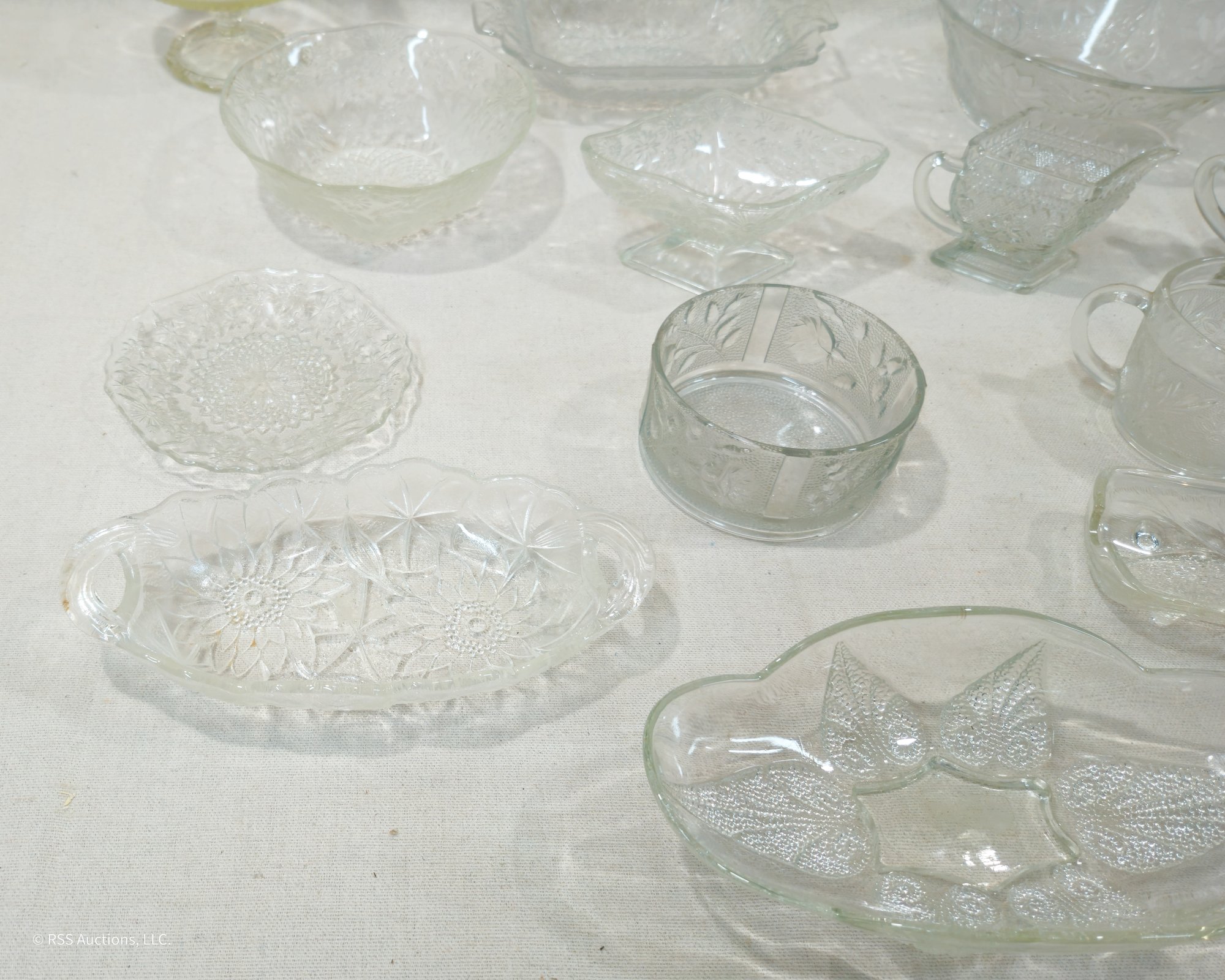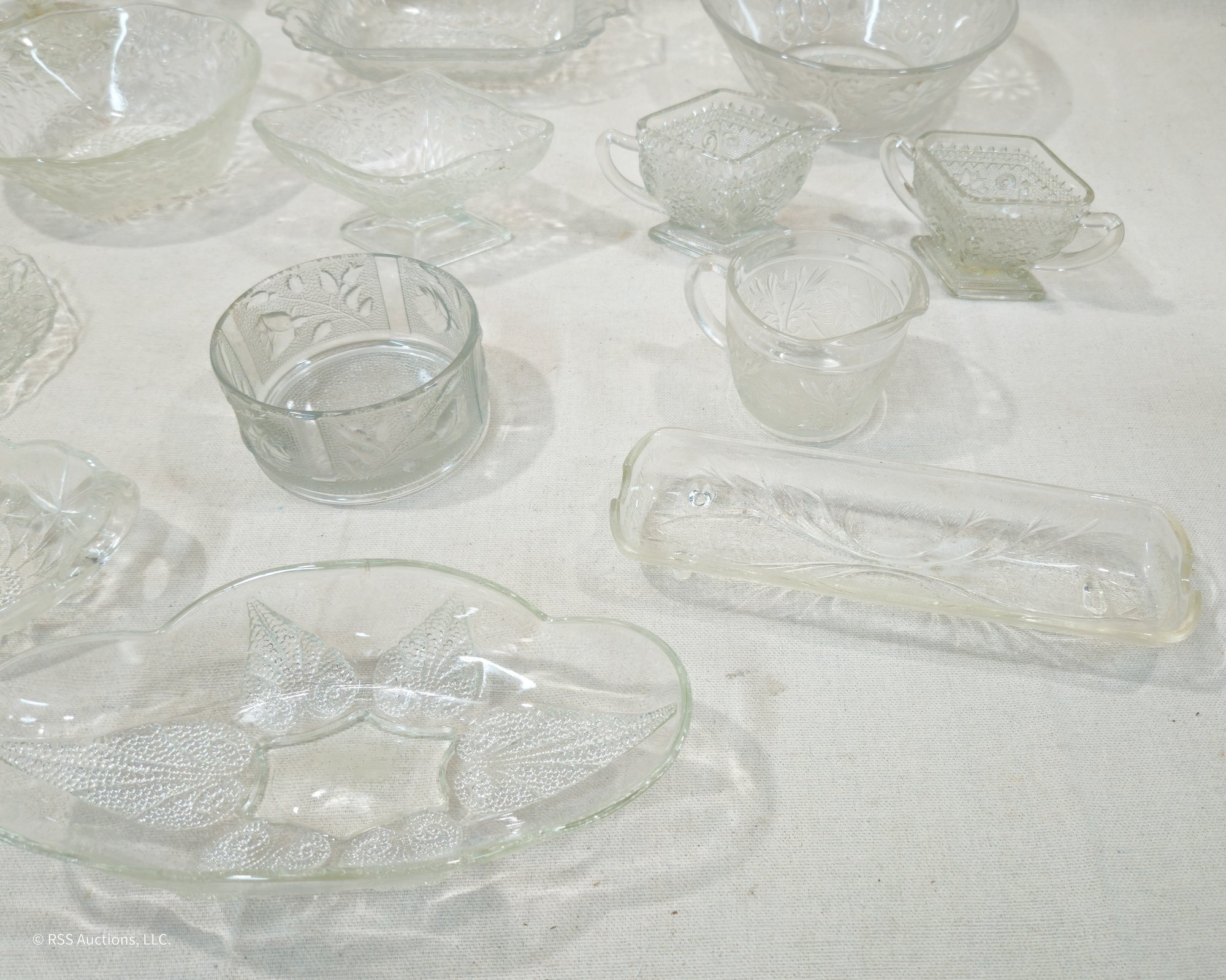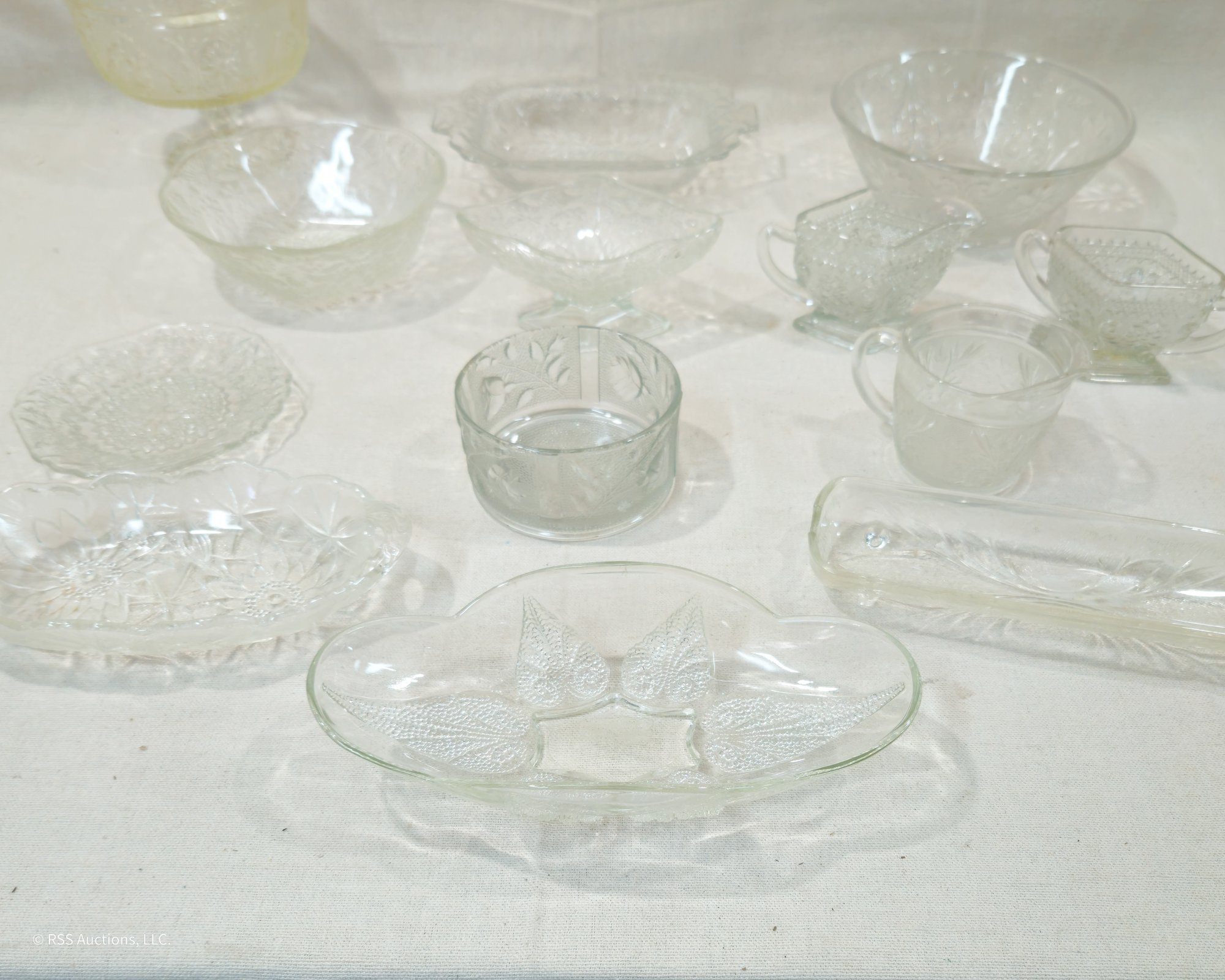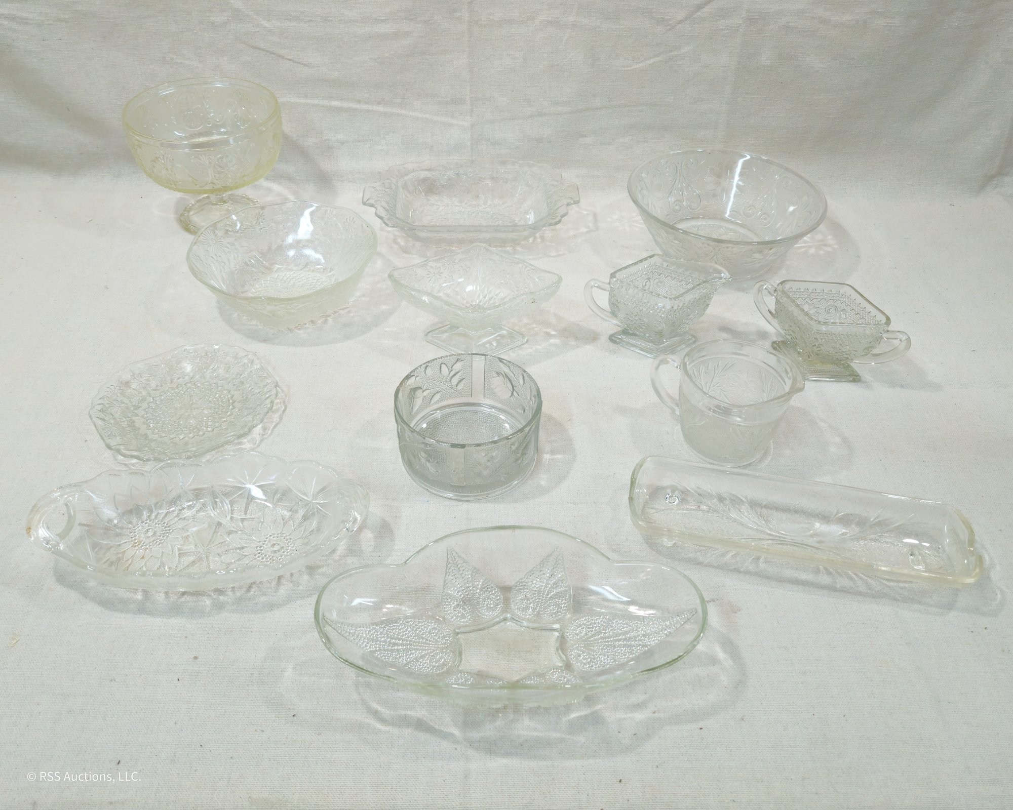 Group of ~13 assorted vintage pattern glassware in various forms and patterns.