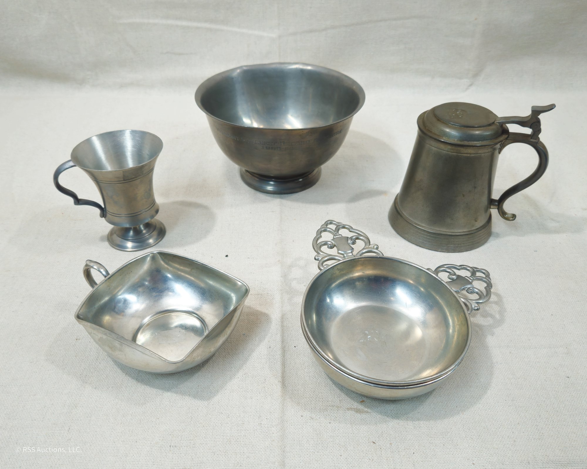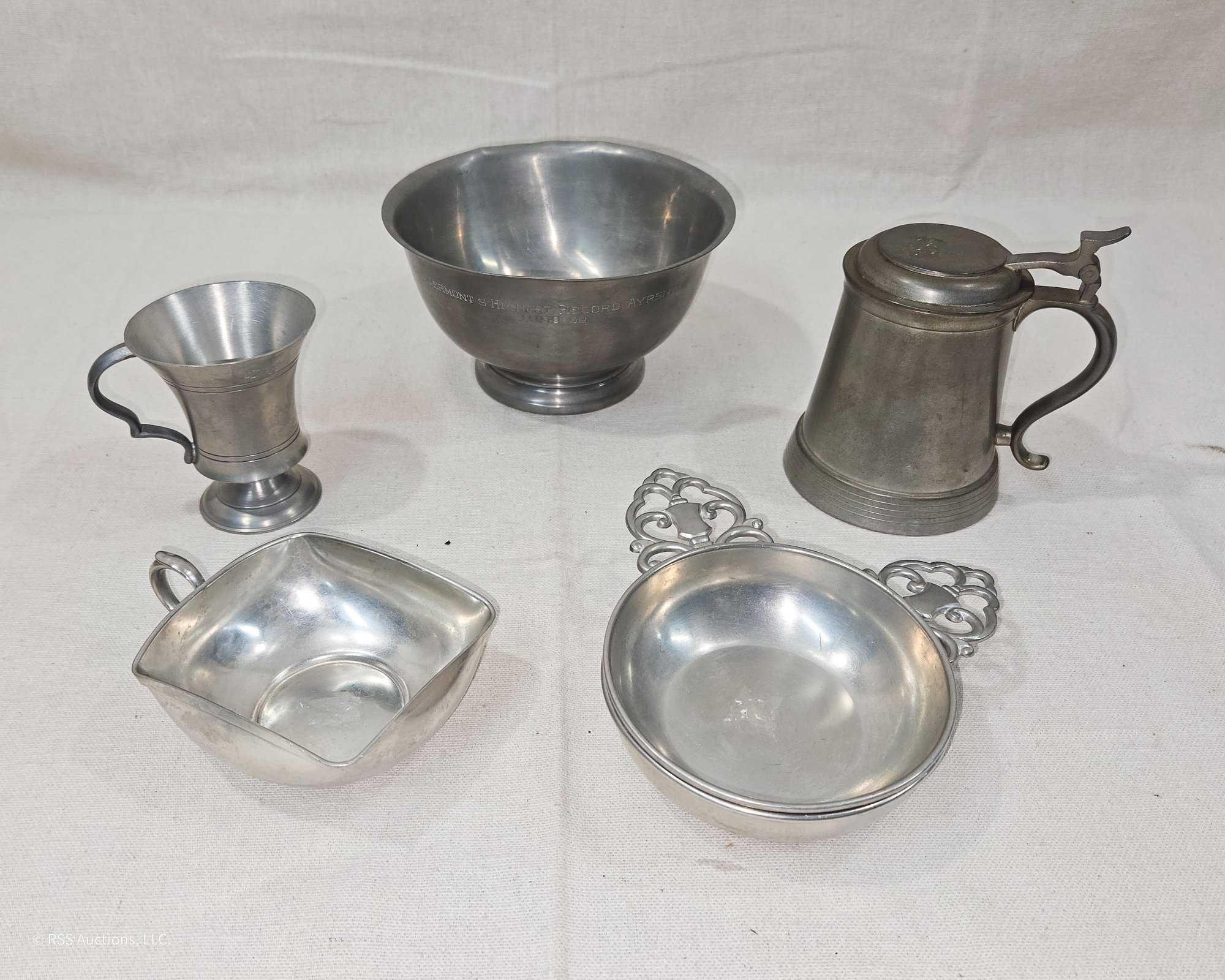 Group of ~6 assorted vintage pewter metalware including a stein, a cup, a Vermont Ayrshire trophy bowl, 2 porringers, and a handled dish.