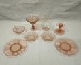 Group of ~7 assorted vintage pink depression glassware including a Fenton Hobnail ruffled rim pedestal compote/dish, a decanter bottle, an Anchor Hocking Oyster & Pearl nappy, 2 Jeanette American/Cube dessert plates, and 2 dinner plates.