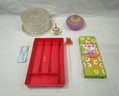 Group of ~7 assorted vintage plastic collectibles including a cake plate server with lid, an Avon Beauty Dust powder container, a red utensil organizer, a Clancey the Clown soap holder/dish, and others.