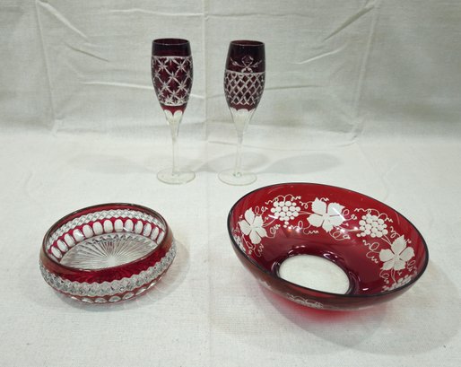 Group of ~4 assorted vintage ruby cut to clear overlay cut glass including a bowl, dish, and 2 champagne glasses. Various manufacturers.