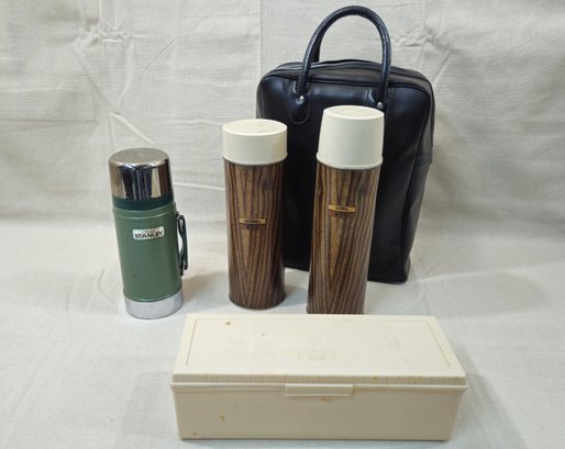 Group of assorted vintage Thermos & Alladin Stanley hot/cold flask containers.