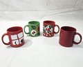 Group of assorted vintage Waechtersbach ceramic mugs including one decorated with apples, one decorated with cherries, one decorated with a cat in a window, and one with plain red glaze. 2 with embossed Waechtersbach/Spain mark on base and 2 with Waechtersbach/Germany mark on base.