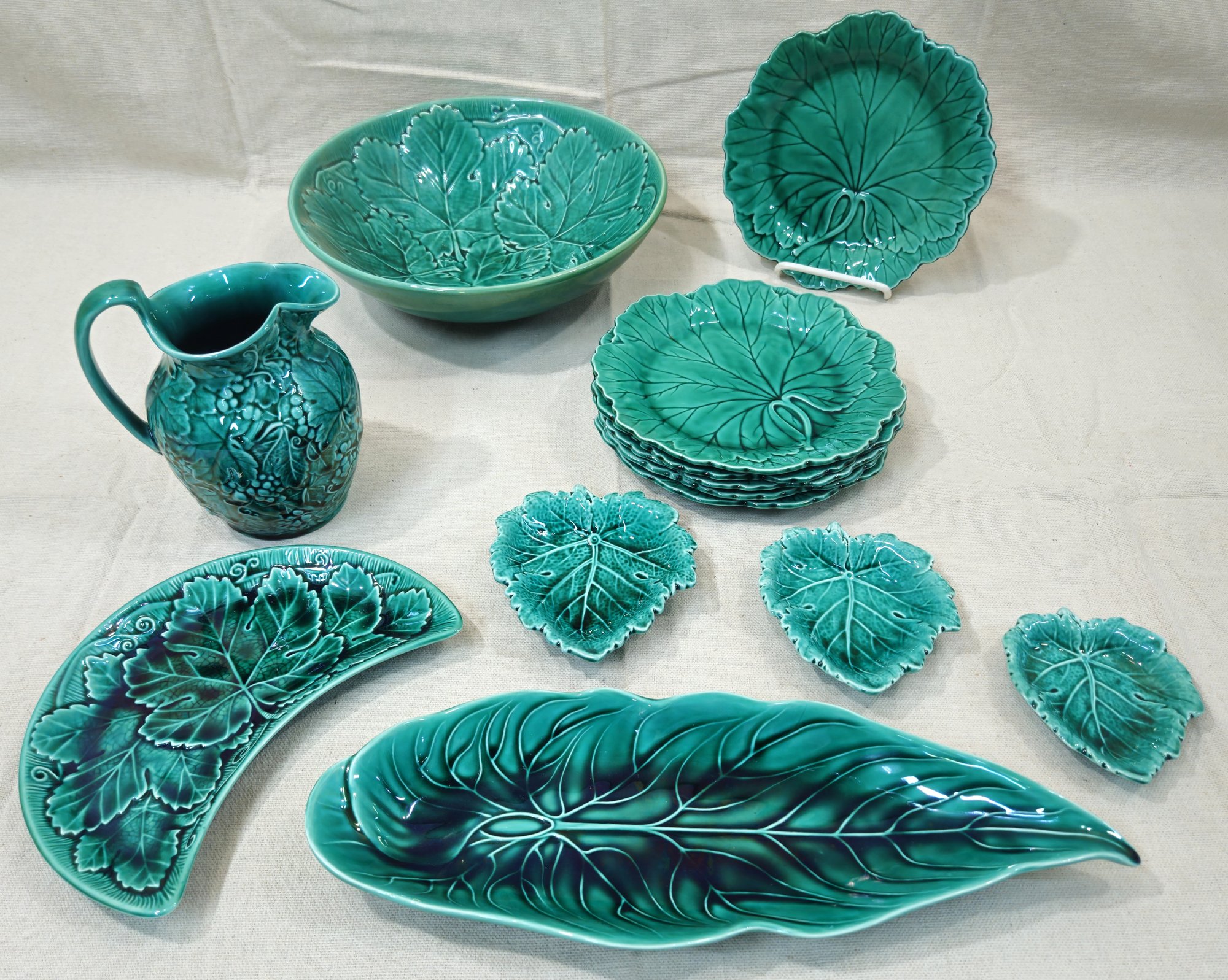 Group of assorted vintage Green Glaze articles including 24oz pitcher, serving bowl, crescent plate, 3 graduated leaf dish set, celery dish, and 6 salad plates. Produced and marked on underside of all pieces by Wedgwood.