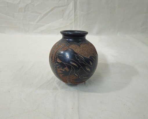 Nicaraguan folk art pottery vase incised/carved/etched with a frog decoration. Unsigned.