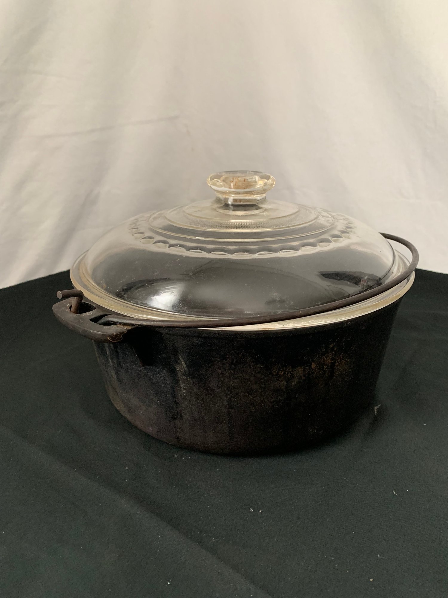 5 quart bail handled cast iron Dutch oven unmarked with Griswold ~10 1/2" glass cover that has octagon logo knob