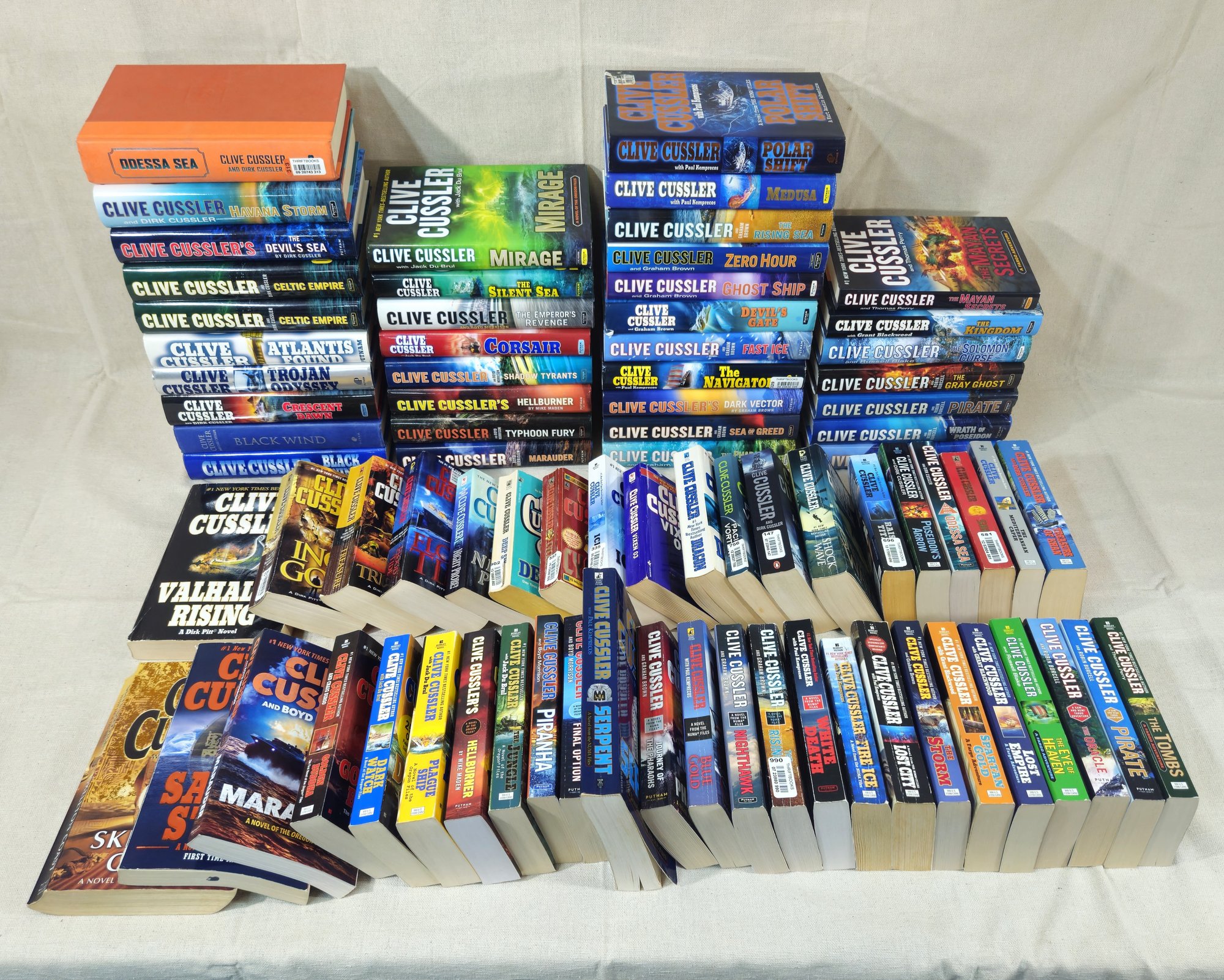 Collection of ~77 Clive Cussler hard & soft cover adventure novels with 42 soft cover books with 1 duplicate and 35 hard cover books with 2 duplicates including complete Dirk Pitts series, complete Oregon Files series, complete Numa Files series, and complete Fargo Adventures series.