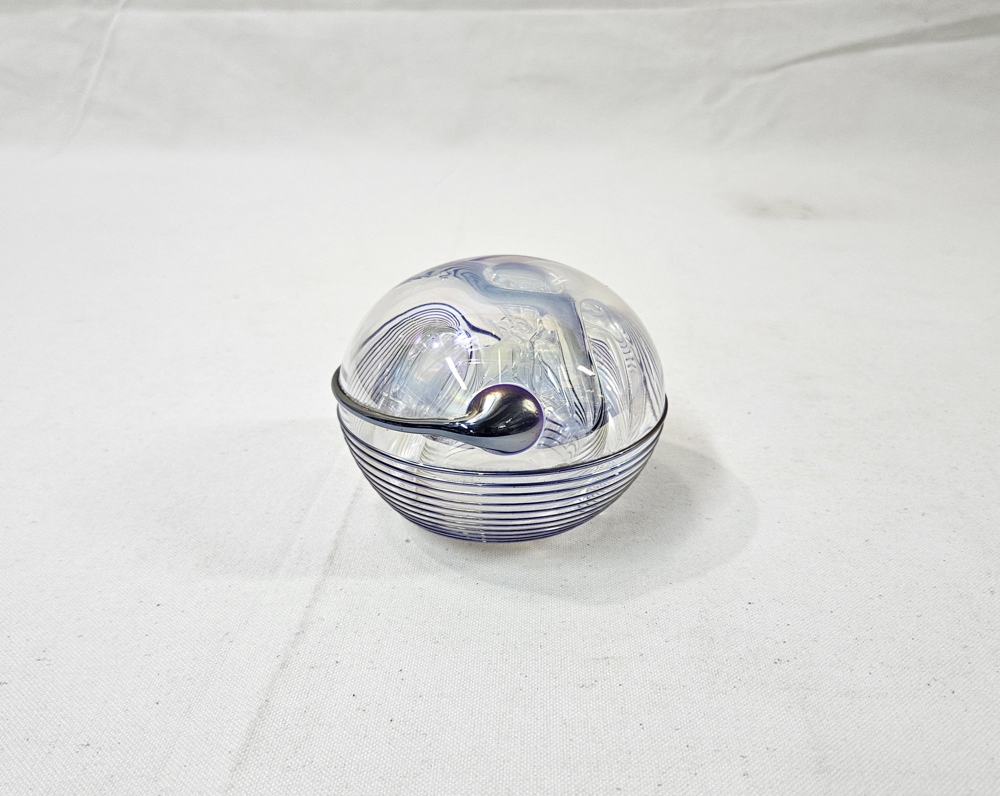 Notes: Contemporary Studio Mount St. Helen Iridescent Swirl Glass Paperweight Signed is pre-owned showing signs of wear commensurate with age & use. Please review photos.