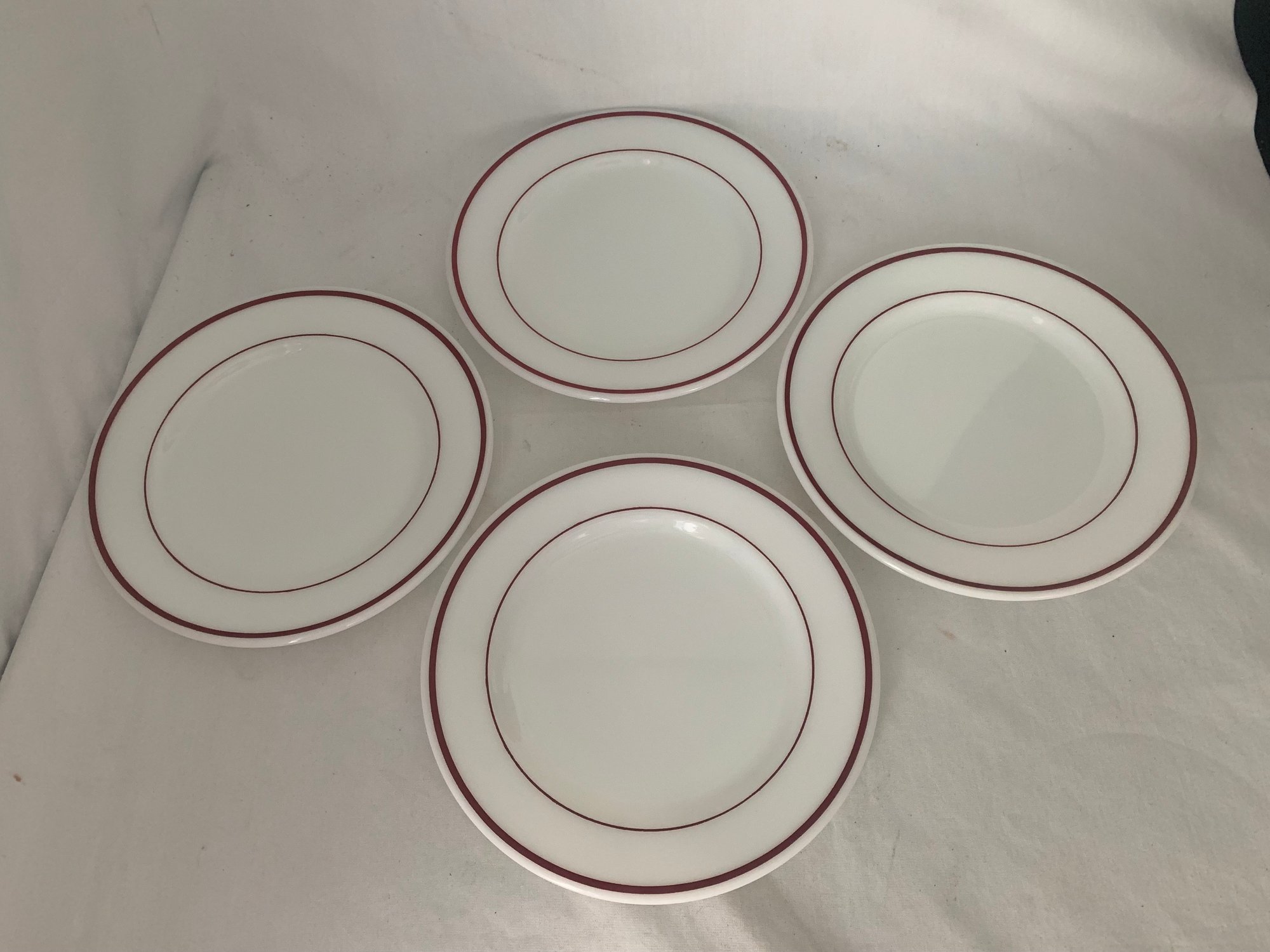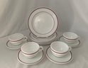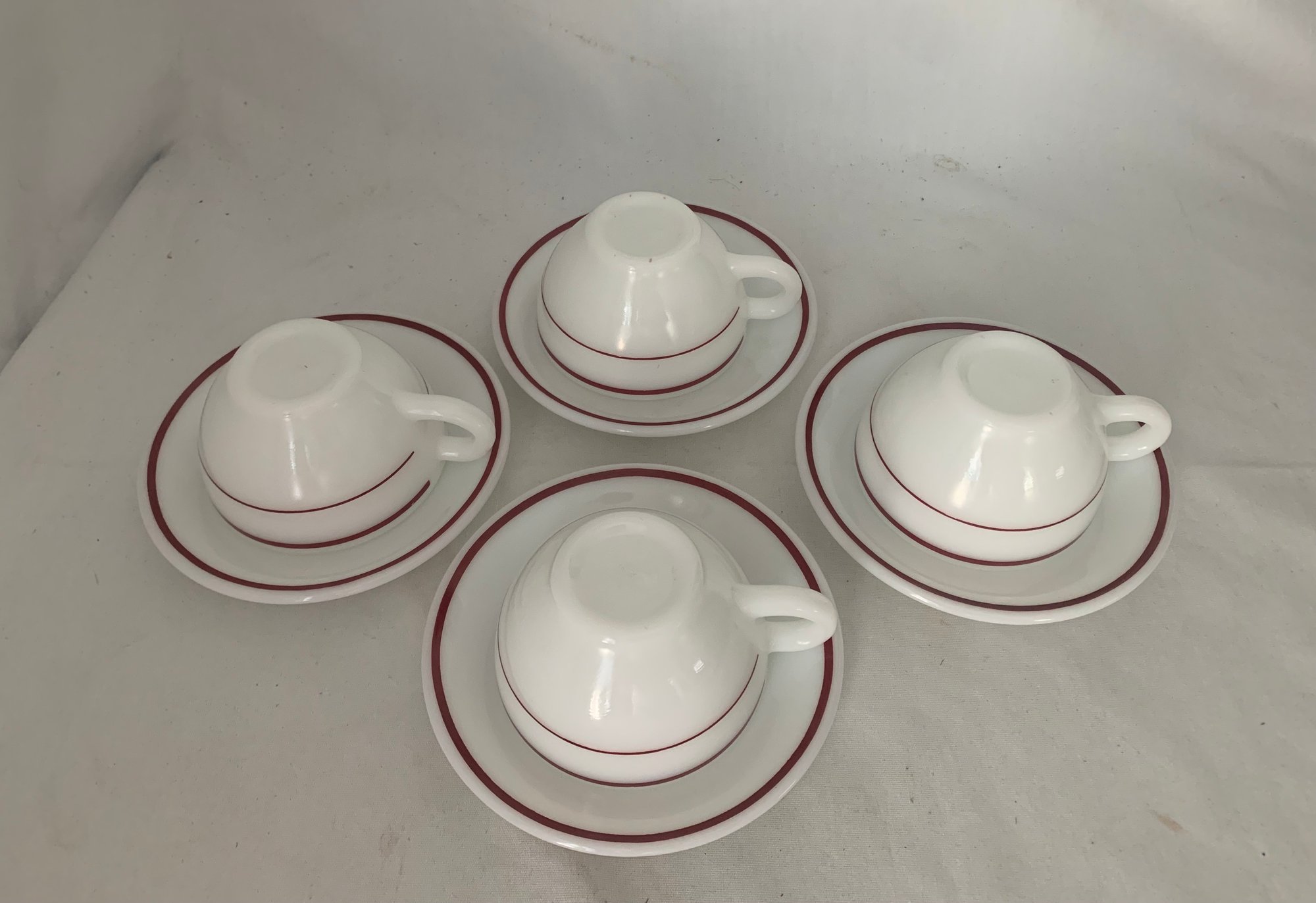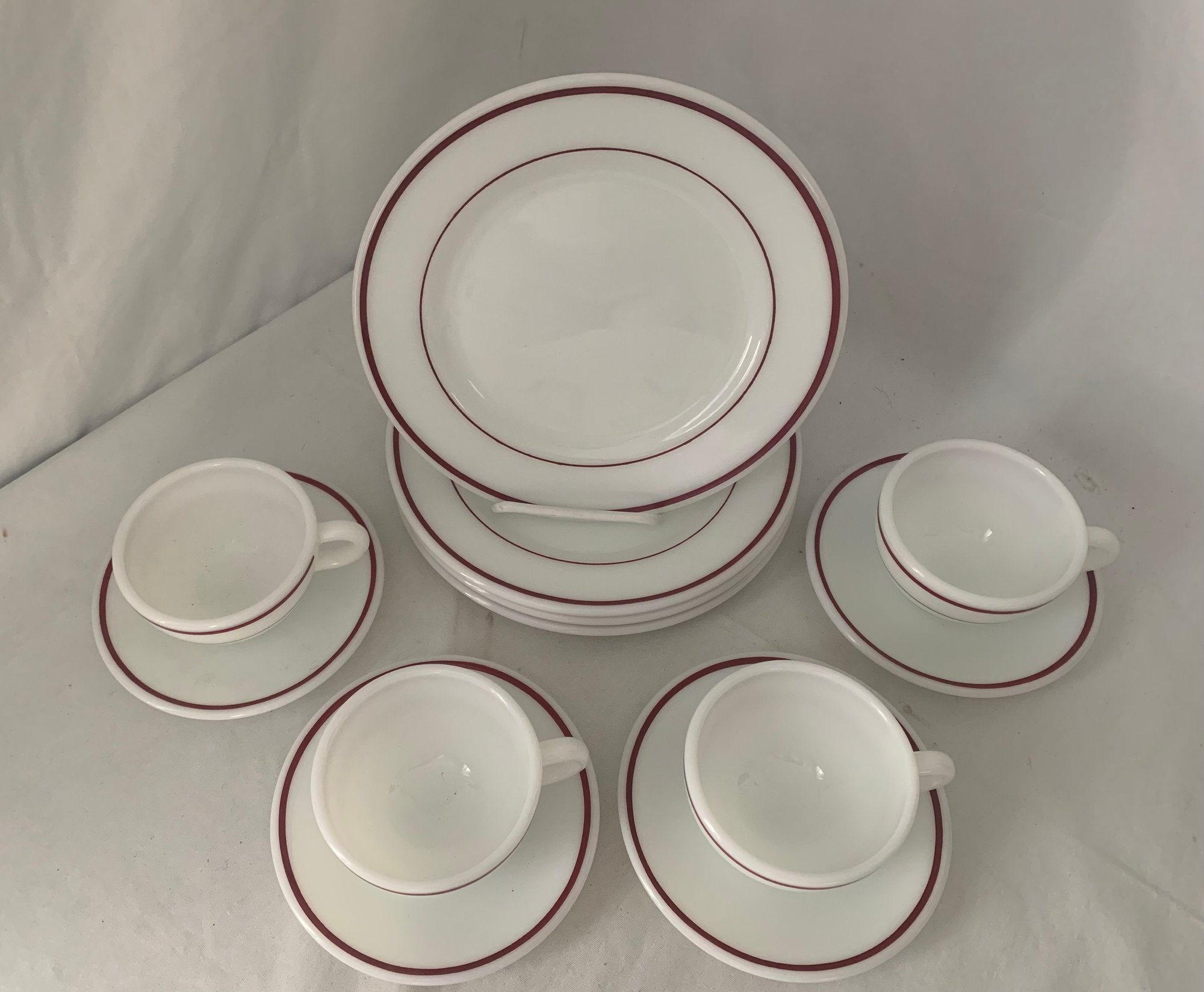 12-piece set of vintage Pyrex Standard weight (700 series) Double Ruby Band commercial tableware set including (4) 701 - 7oz. cups, (4) 702- saucers, and (4) 702- 9" dinner plates.