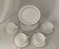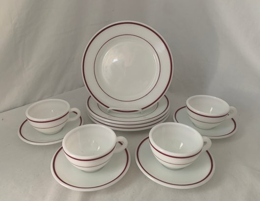 Notes: Corning Pyrex Double Ruby Band Commercial Tableware 12-pc. Set is pre-owned showing light signs of wear commensurate with age & use and all pieces with no major apparent identifiable blemishes or flaws. Please review pictures.