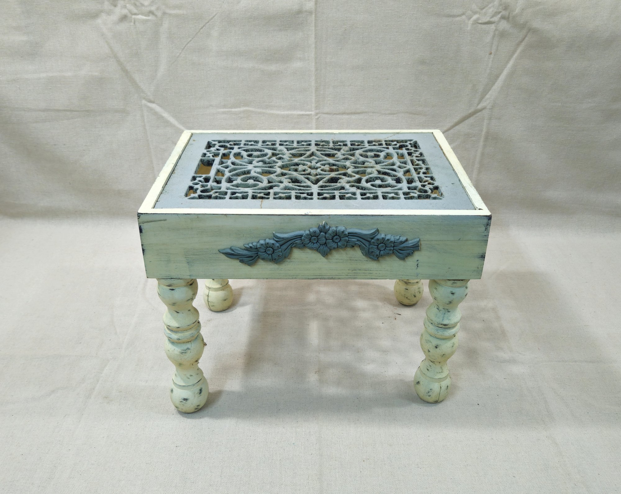 Decorative wood step stool with cast iron vent grate step top and distressed paint finish.