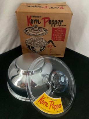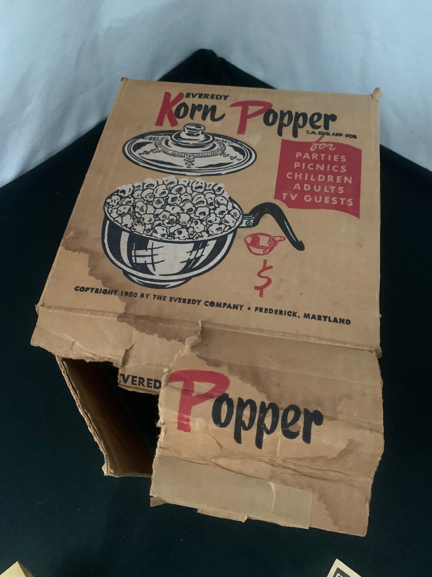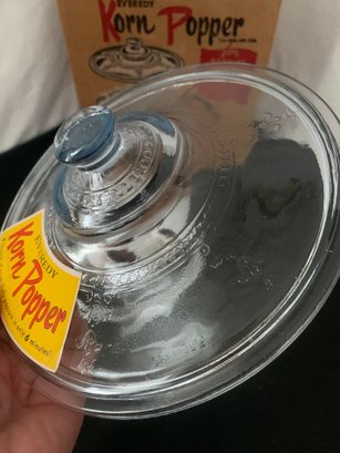 1950 - The Everedy Company, Maryland - Korn Popper new in box -glass cover has Sapphire blue 'Philbe' design (Fire King design)