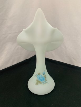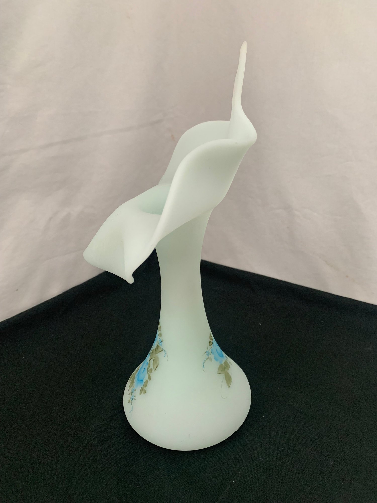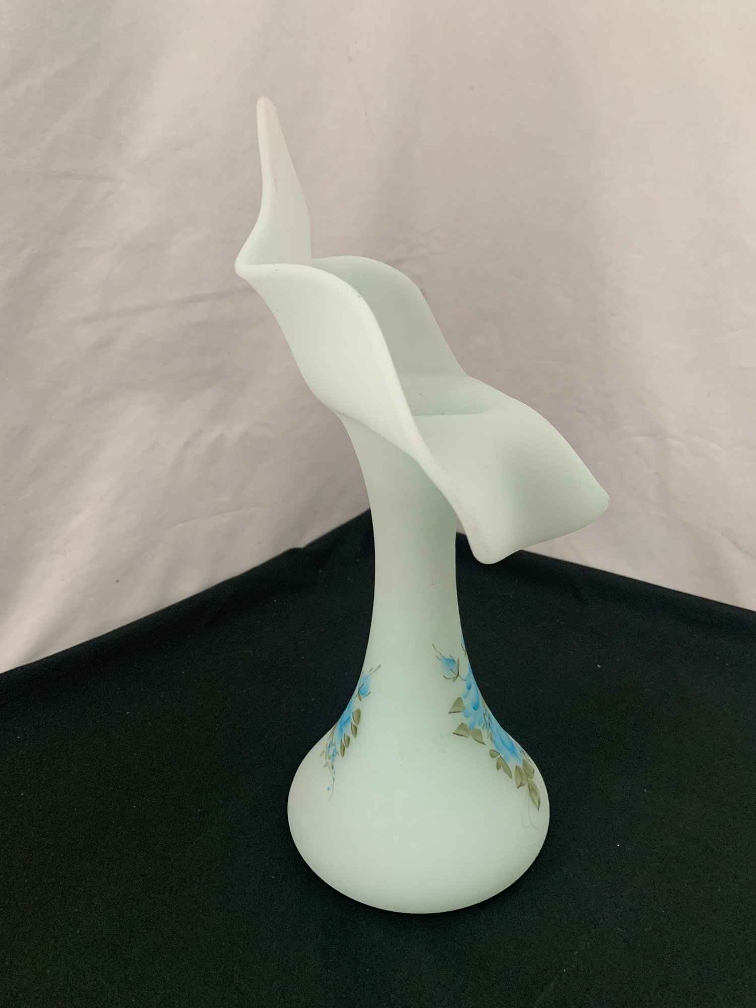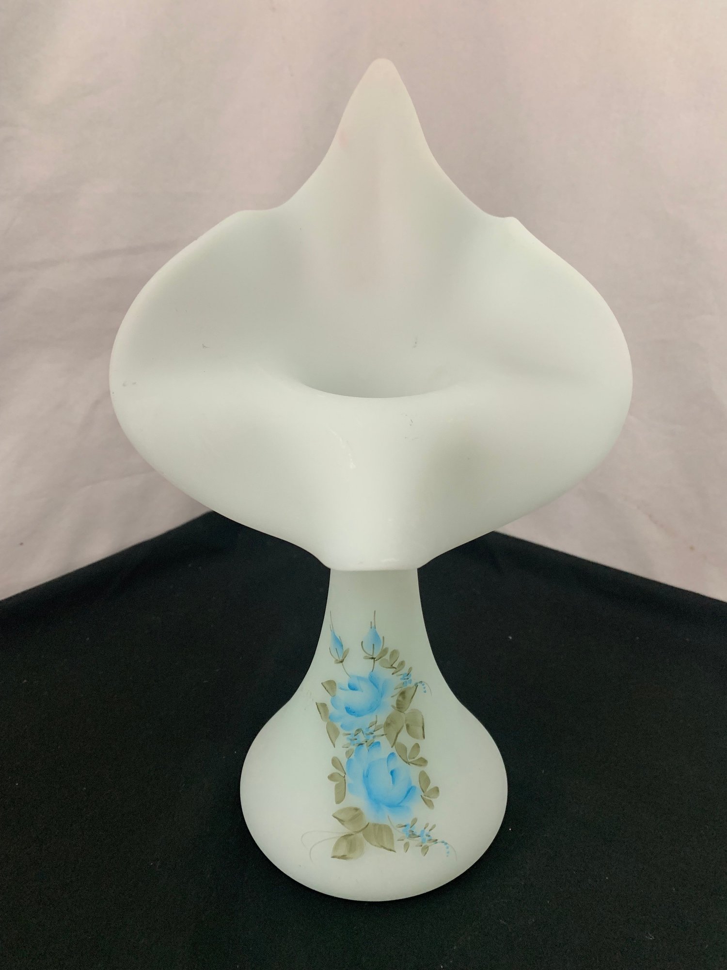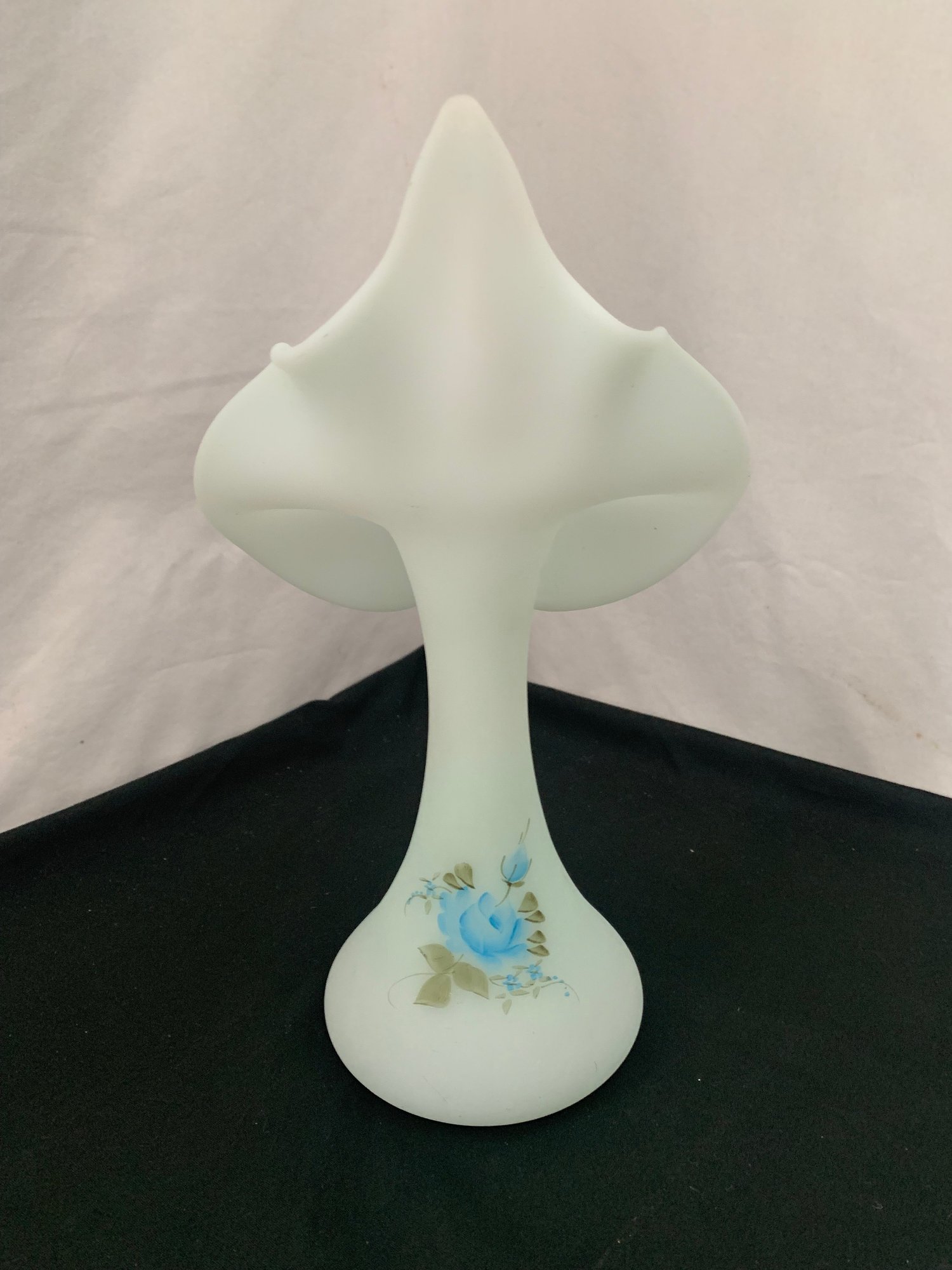 Fenton Glass Jack-in-the -Pulpit Vase Blue satin hand painted (by K. Lauderman) ~11"