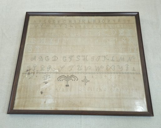 Framed antique Mary Jane English's Sampler of Brownington, VT. Partial related recorded info on remaining backing paper of frame.