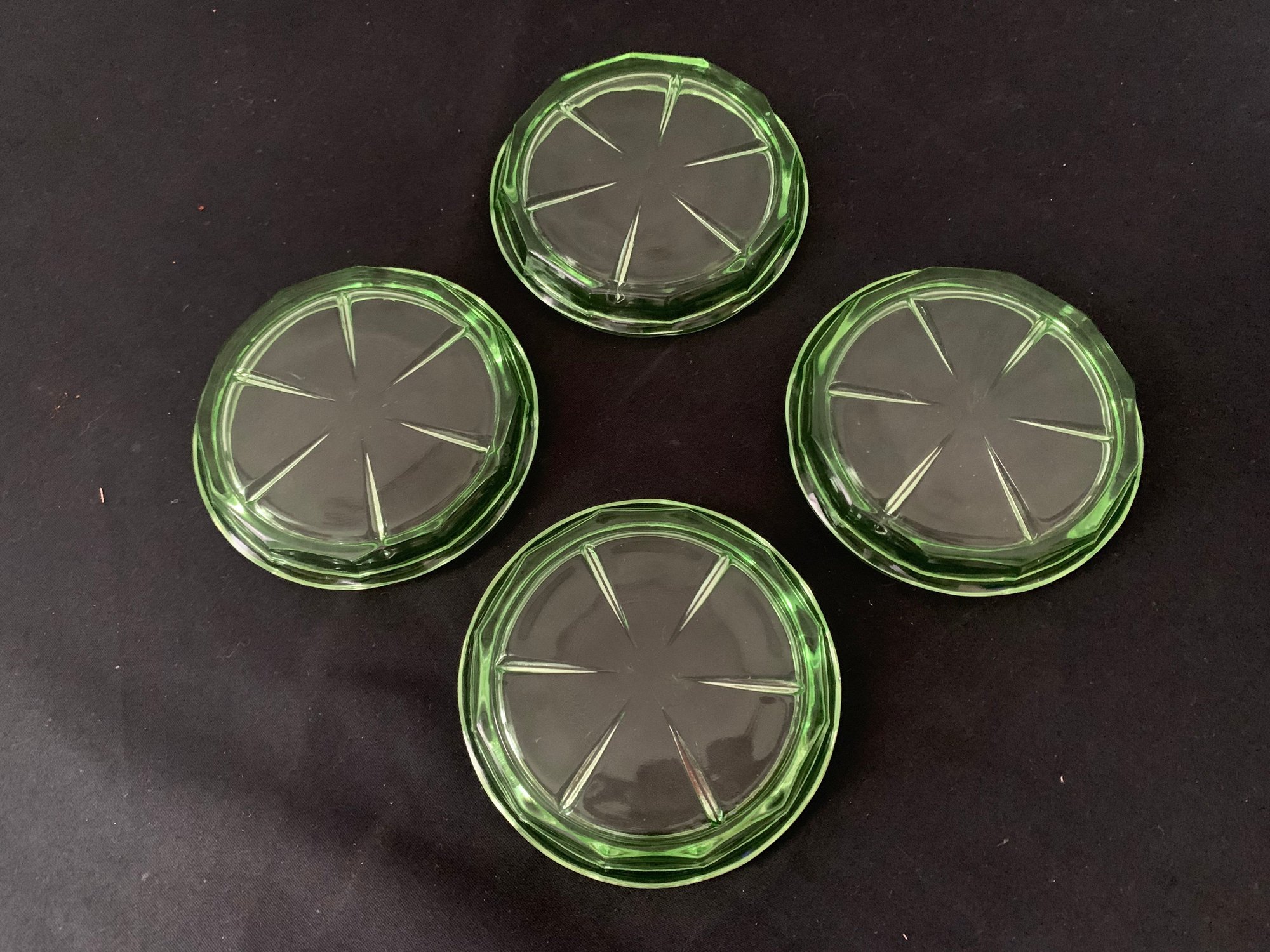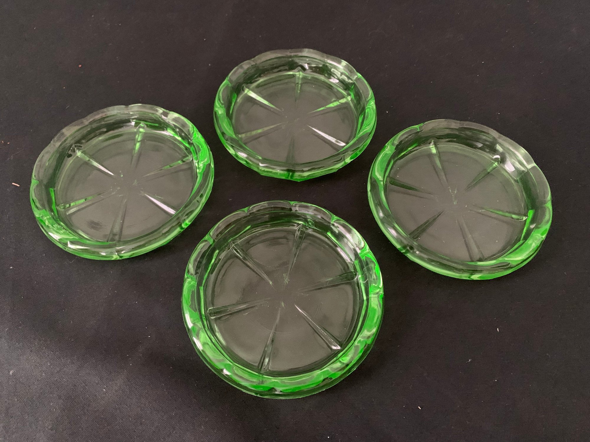 Set of 4 Hazel Atlas rayed 3 3/4" green UV glow coasters