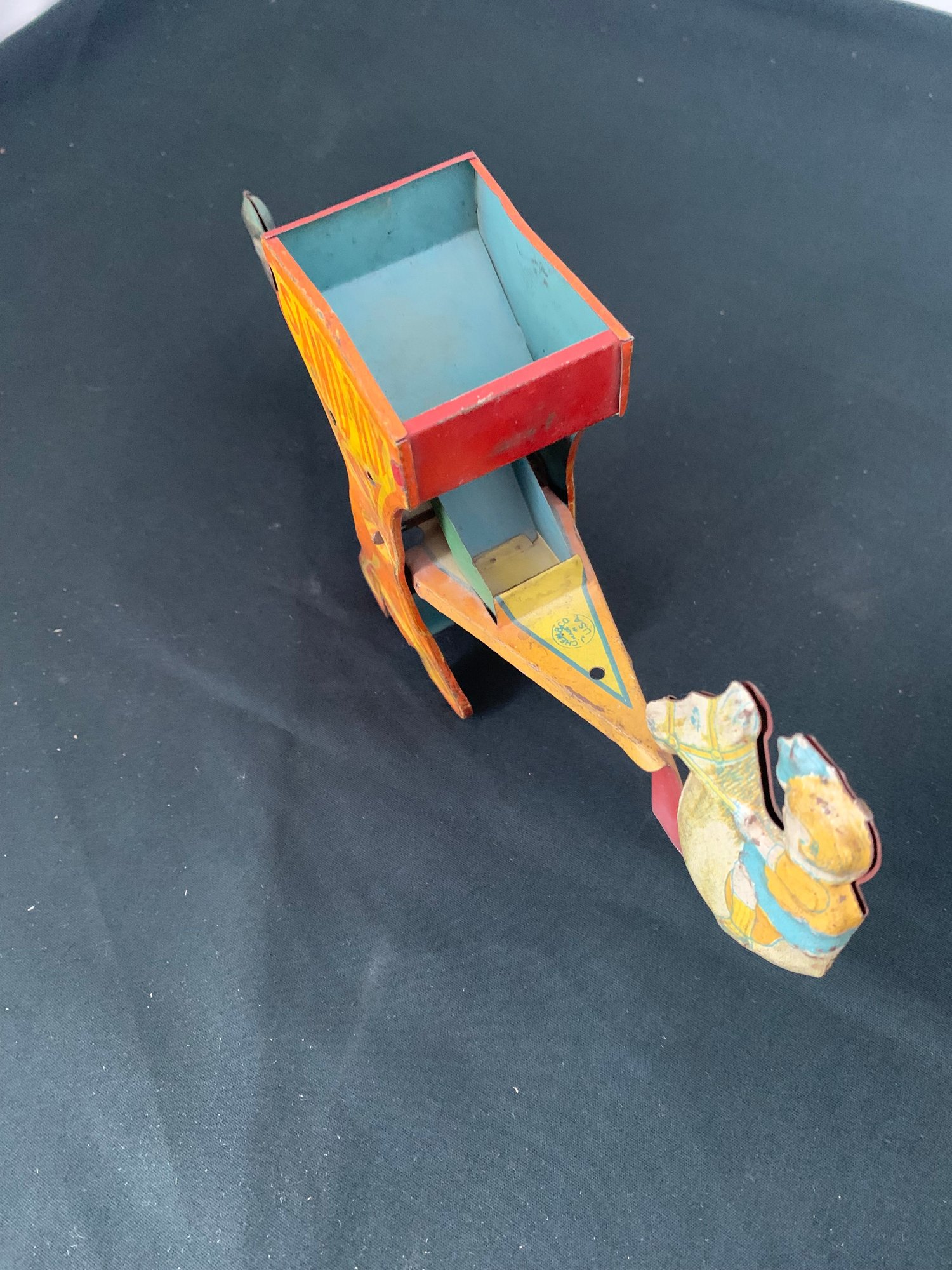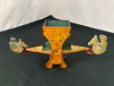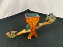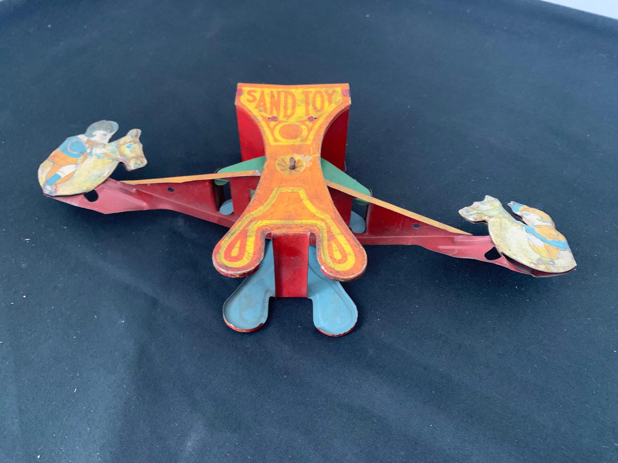 Early tin toy children on horse seesaw with orange, yellow & blue colors