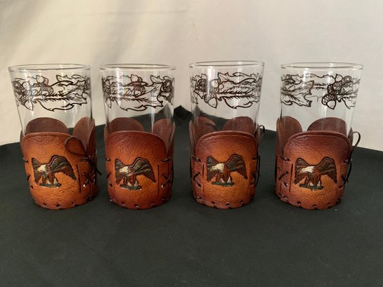 Group of ~4 Libby Bamco glasses with acorns & oak leaves and western leather sleeves tooled with eagles.