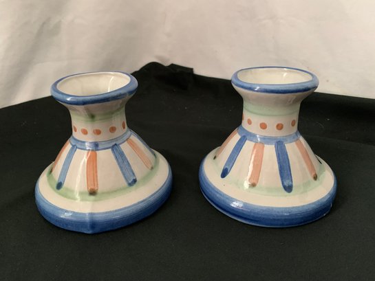 M A Hadley Pottery Dots & stripes candlesticks 4" 2 pieces
