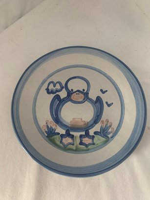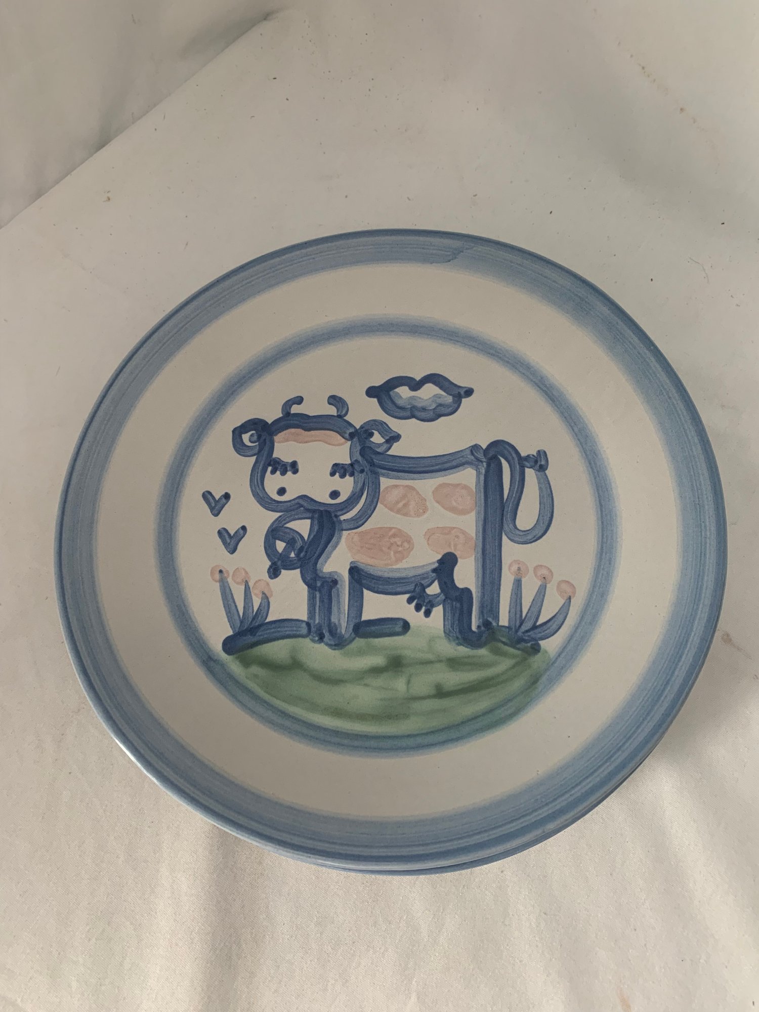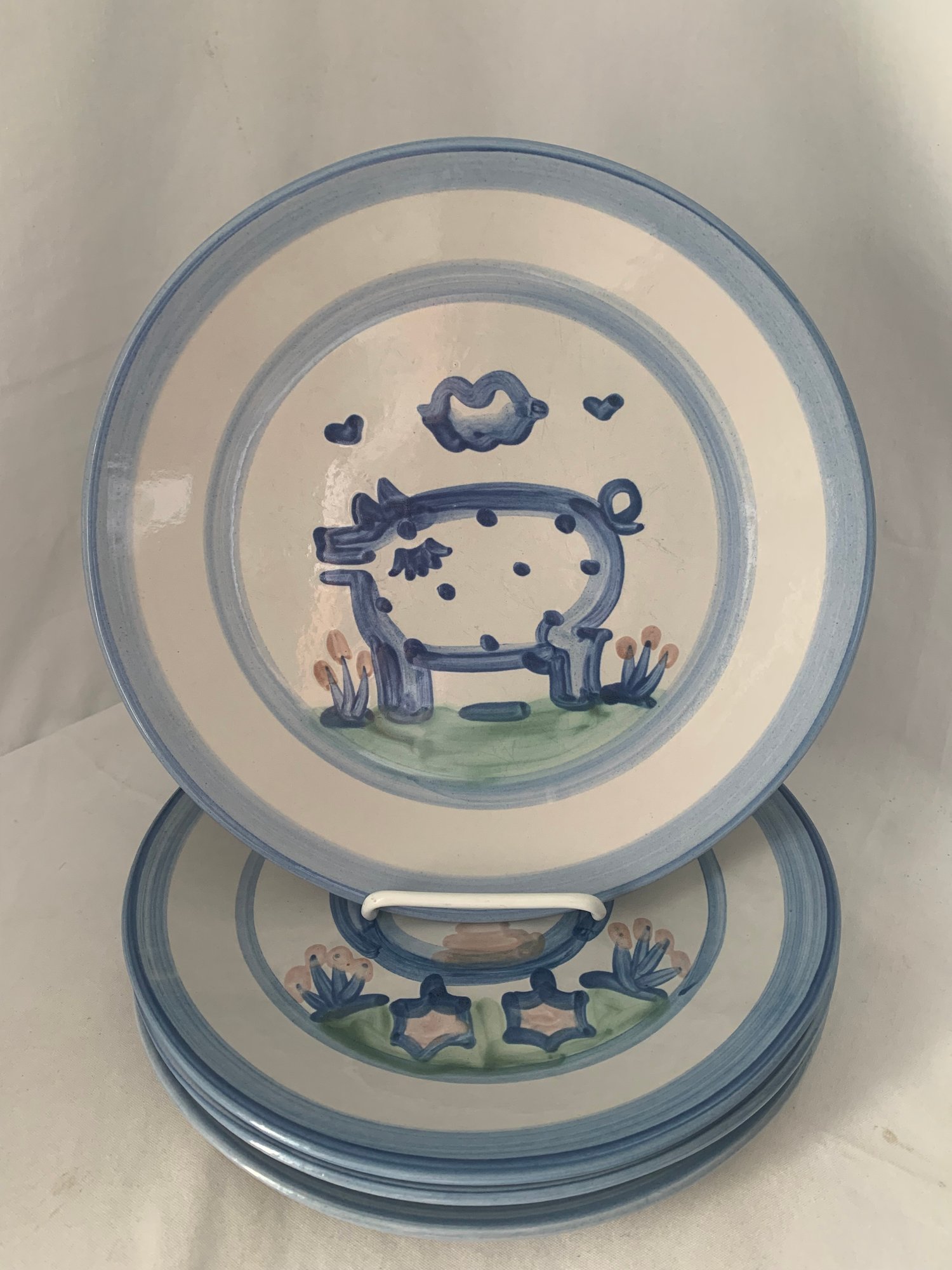 Set of ~4 M. A. Hadley Pottery Country dinner plates each individually decorated with a pig, a cow, a duck, and a farmer. Marked on base M.A. Hadley.
