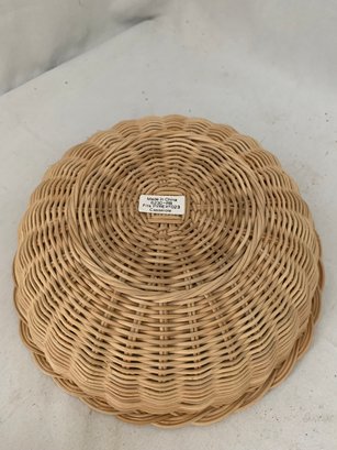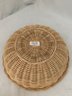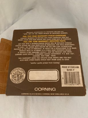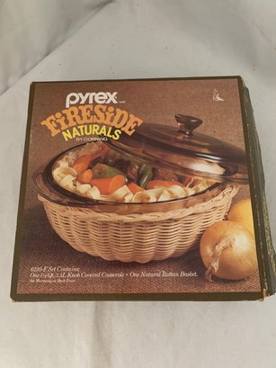 New in open box Pyrex Ware Fireside Naturals by Corning 6230-F set including 1 1/2qt. casserole, knob lid, and one natural rattan basket. Produced by Corning Glass Works.