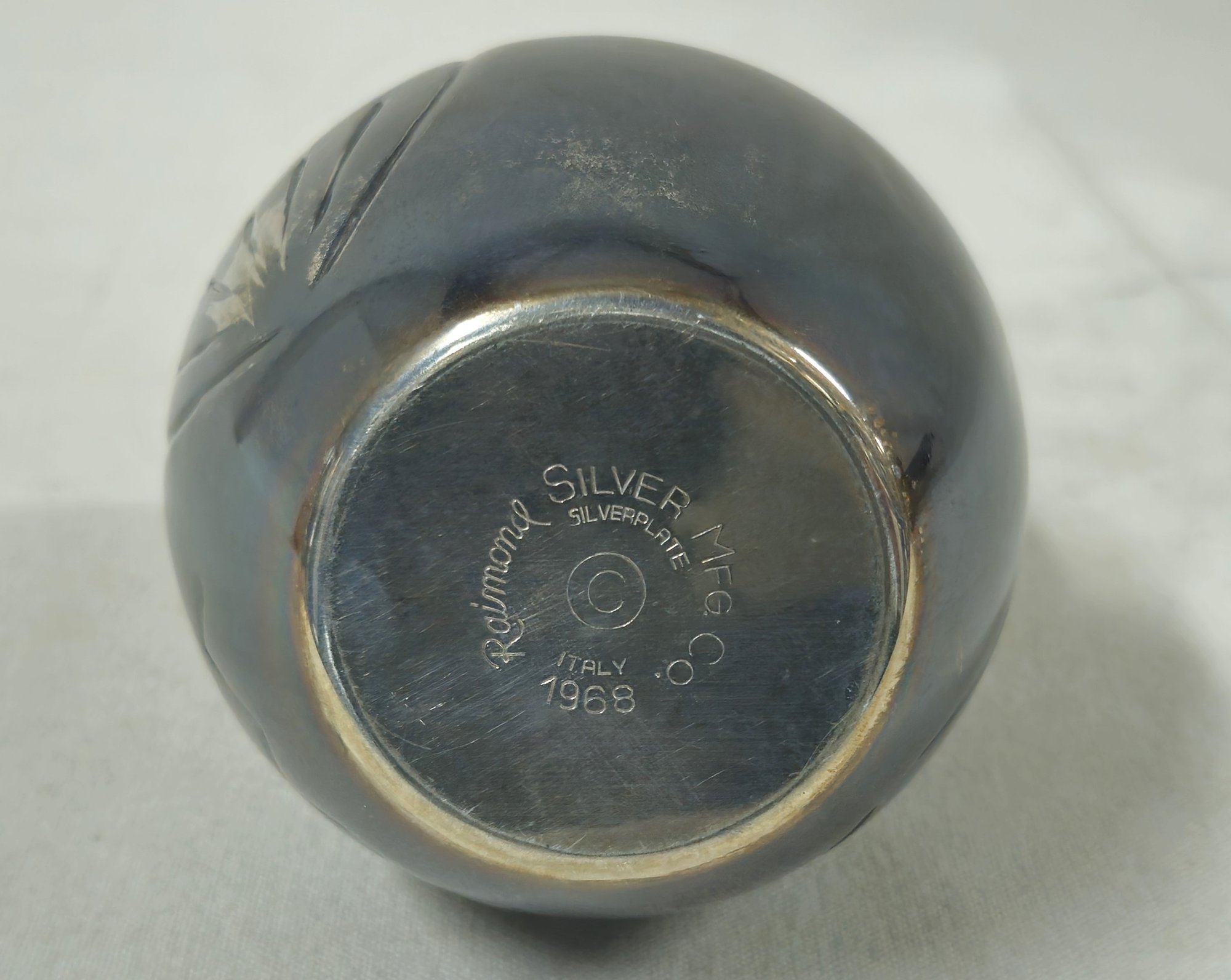 Silverplate owl coin bank produced and marked on base by Raimond Silver Mfg. Co. Made in Italy.